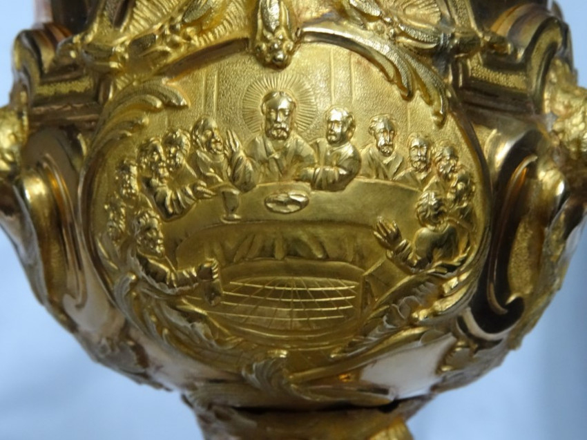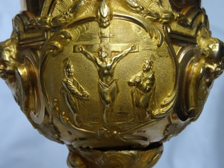 A szobrászi módon megkomponált darab lendületes és gazdag díszítése három-három jelenetet rejt. A talp az Eucharisztia ószövetségi előképeit idézi (Kaleb és Józsué, Melkizedek áldozata, Hágár és gyermeke), míg a csészén az utolsó vacsora, az Olajfák-hegyén imádkozó Krisztus és a keresztre feszítés kapott helyet Mária és János alakjaival.
