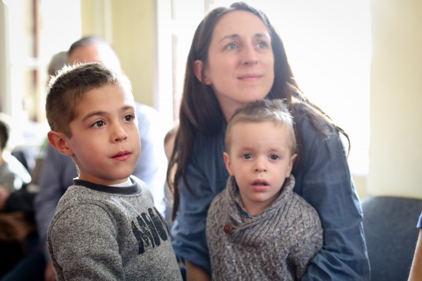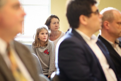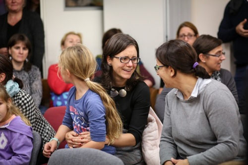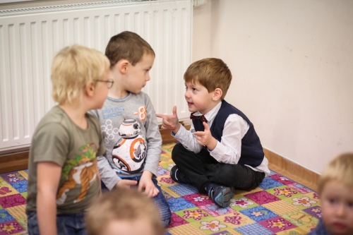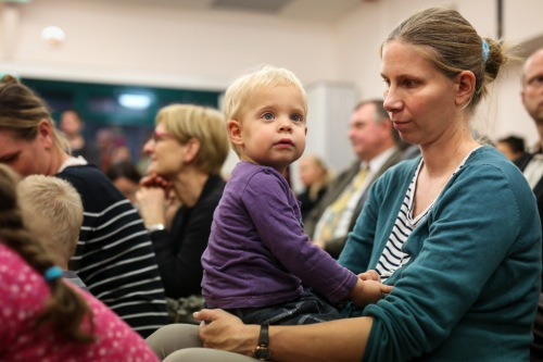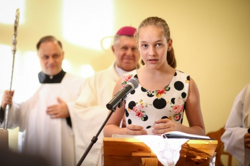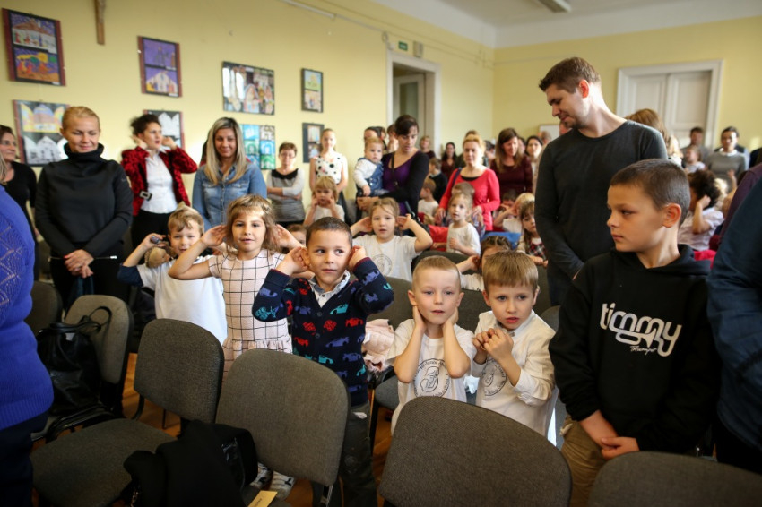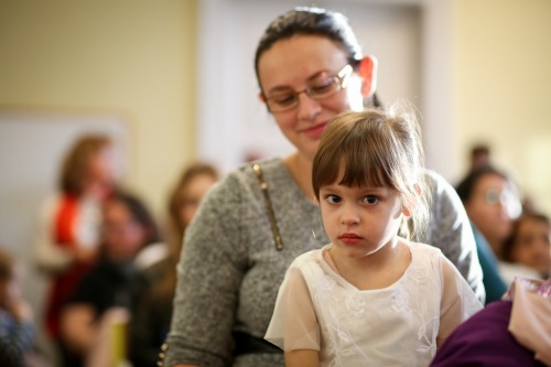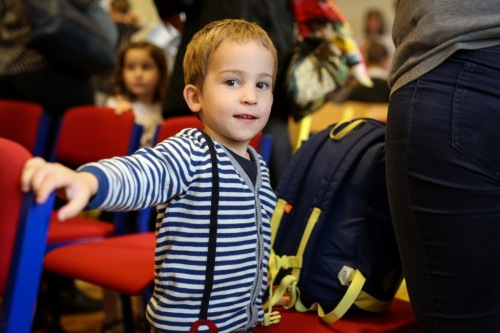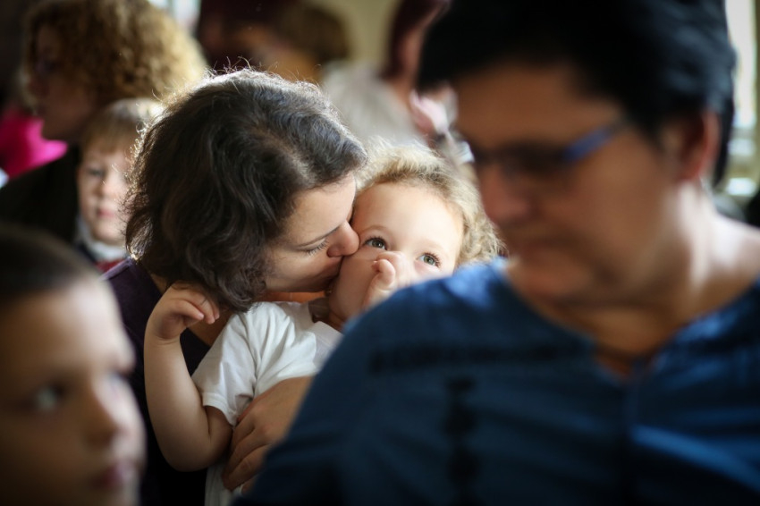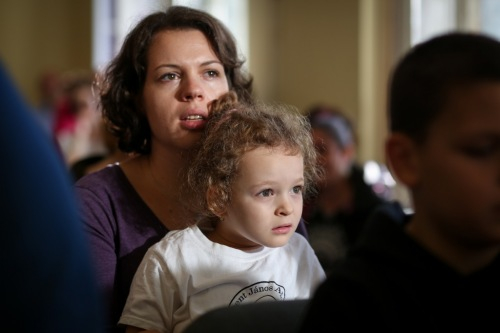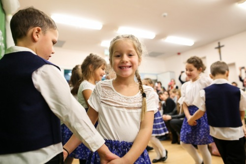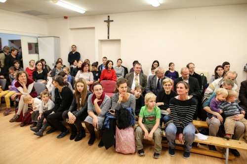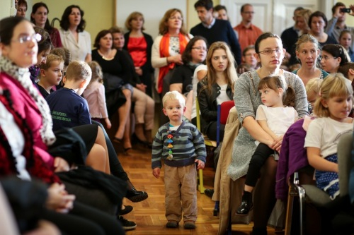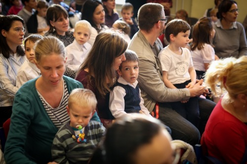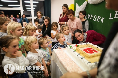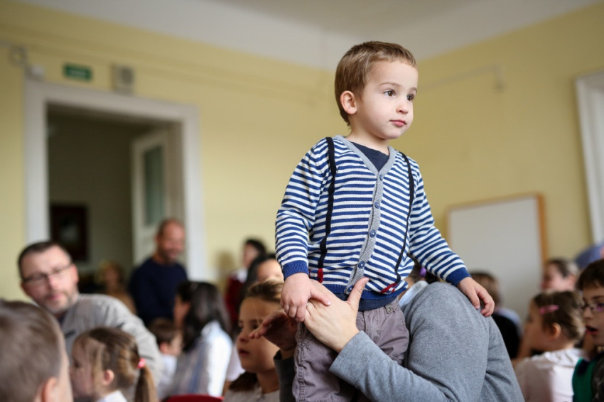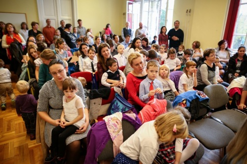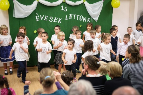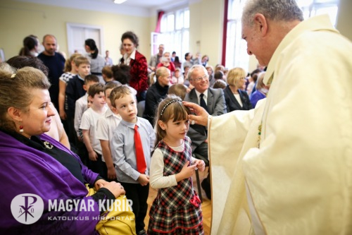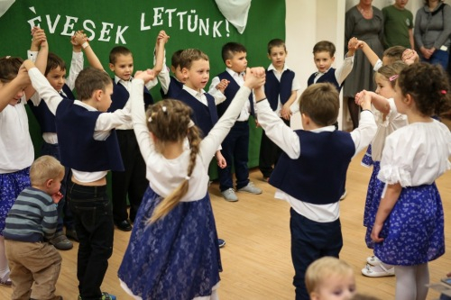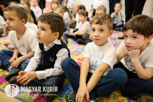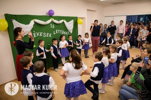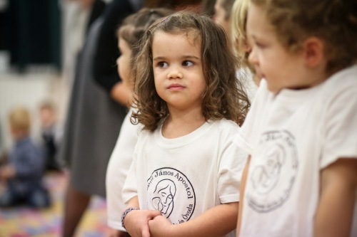A Szent János Apostol Katolikus Általános Iskola és Óvoda dísztermében gyülekezünk. A helyszínválasztás oka az, hogy a korábban önálló Szent Anna-óvodát és a Szent János apostol iskolát 2016-ban összevonták. Odaát, a közeli óvoda épületében hely sem igen lenne ünnepelni – ezt másfél órával később magunk is megtapasztaljuk majd. Ám a nagy ünneplésre még az iskola díszterme is kicsi, pedig minden szülő és minden gyerek biztosan nincsen itt. Sűrűn vagyunk, a többség gyermeküket ölükben tartó anyukákból áll; a gyerekek némelyike időnként kiszabadul „a fogságból”, és felfedezőútra indul. Másokat éppen anyukájuk viszi sétálni a széksorok mentén. Nagy az alapzaj; úgy tűnik, a legkisebbek máris unatkoznak.