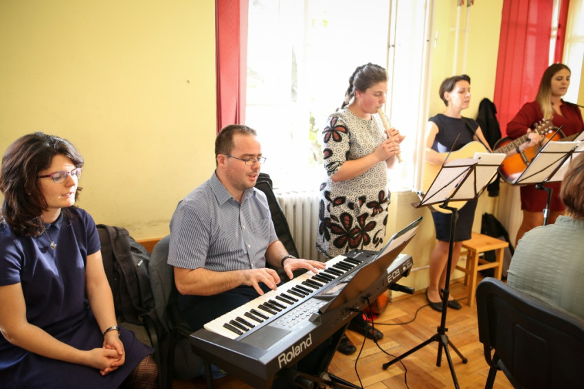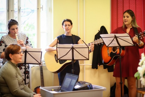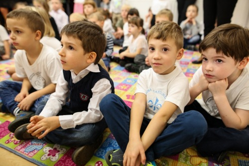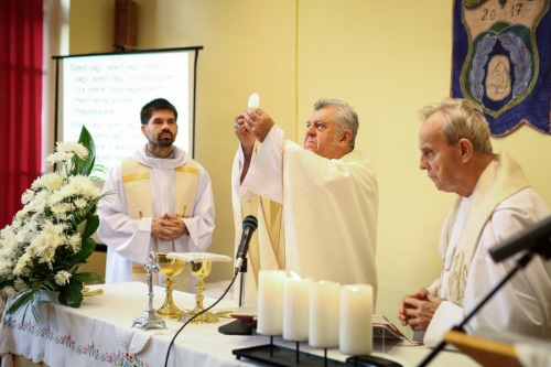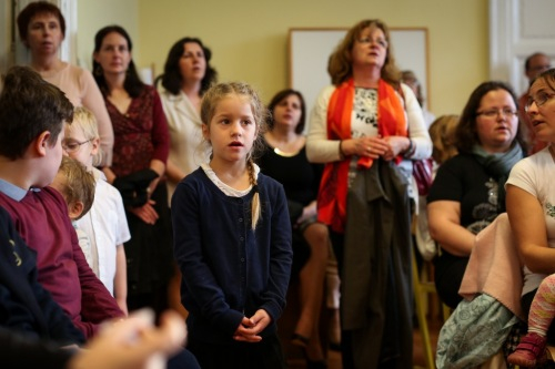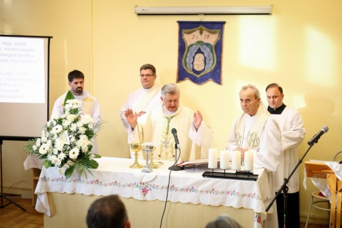 Nem sokkal később, Käfer György igazgató köszöntőszavai után gitáros mise kezdődik. Amint elhangzik az „Emeld fel a kezed, és áldjad Őt” kezdetű dal első sora, a gyerekek lelkessé válnak, ehhez ugyanis mutogatni kell. Látszik rajtuk, hogy most hirtelen érintve érzik magukat; kívülről tudják a szöveget, és hogy mikor kell trappolni, tapsolni. Az evangélium az alkalomnak megfelelően az a rész a Máté-evangéliumból, amikor gyerekeket visznek Jézushoz, és ő azt mondja róluk: ilyeneké a mennyek országa.