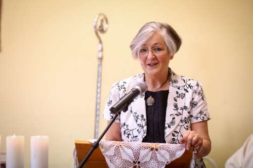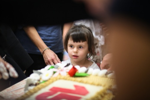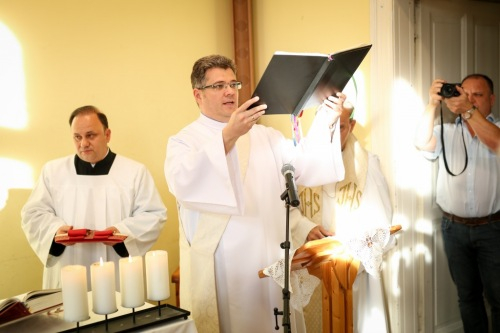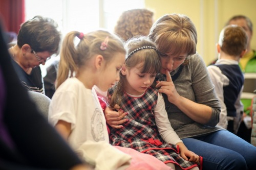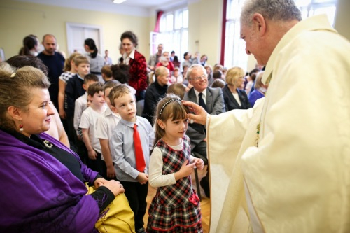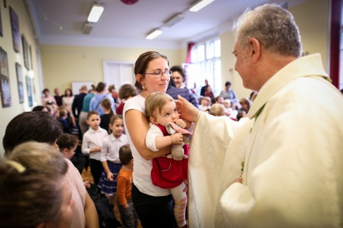 Áldozás után ismét a gyerekek nagy pillanatai következnek: kimehetnek a püspökhöz, aki keresztet rajzolva a homlokukra Isten áldását közvetíti. Hosszú sorokban, hosszan várakoznak; a félénkebbeket anyukájuk kíséri. Aztán Sergőné Egedi Katalin óvodavezető mindenkit az óvodába invitál.