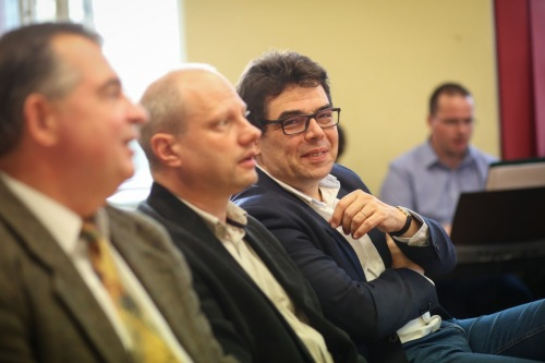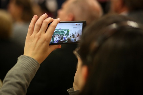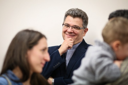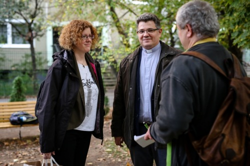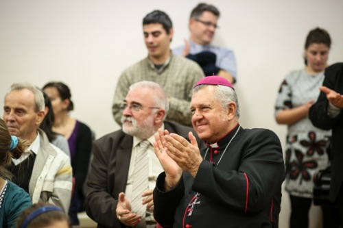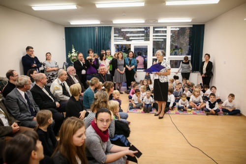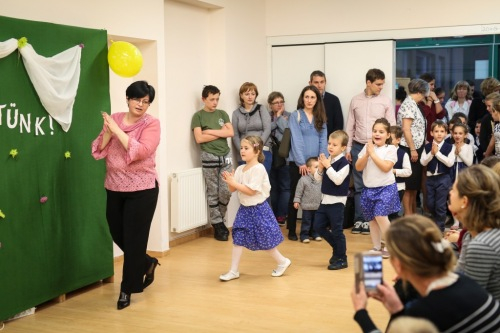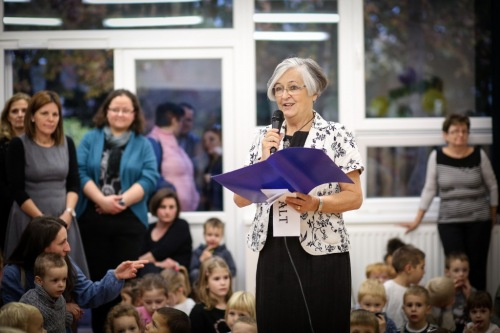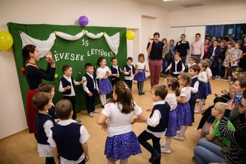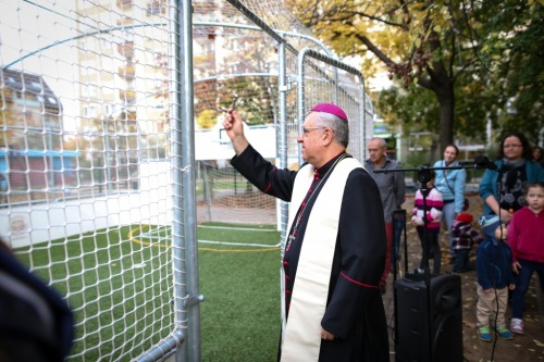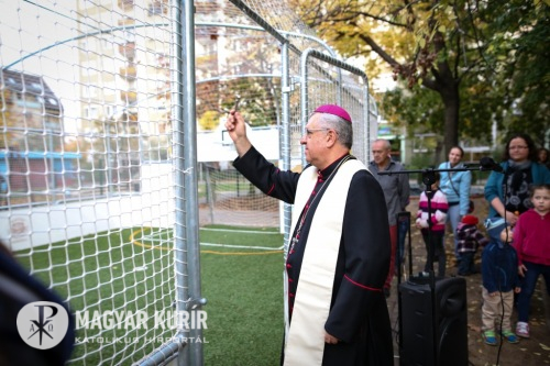 A kertben először a műfüves pályácska mellett várakozunk. A Buzánszky Jenő által 2015-ben alapított Ovisport Alapítvány elnöke, Molnár Andrea elmondja: 249 ilyen pályát létesítettek eddig, ebből 68-at Budapesten. De a Szent János az első fővárosi katolikus egyházi ovi, amellyel együttműködtek. A püspök megáldja a pályát, majd a kicsinyke aulába vonulunk: az oviscsoportok már javában készülődnek az ünnepi műsorra. Az óvodavezető beszédet mond, amelyben a szeretet mint érzelem és életszentség összefüggéséről, a kettő egységéről szól, amelyre az óvoda törekszik. – Nevelőtestületünk gyökereket és szárnyakat növeszt a gyerekeknek a szülőkkel együttműködve – teszi hozzá.