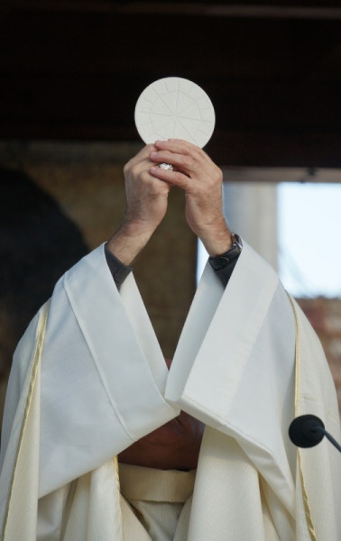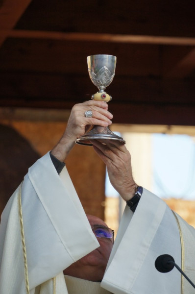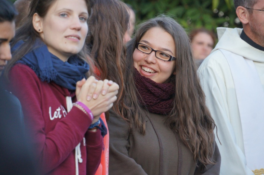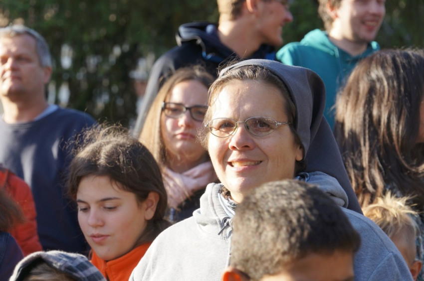 A négy órakor kezdődő szentmisére sok ezer ember – fiatalok és idősebbek, szerzetesek, családok –, öröm és színes egység töltötte be a plébániakertet.