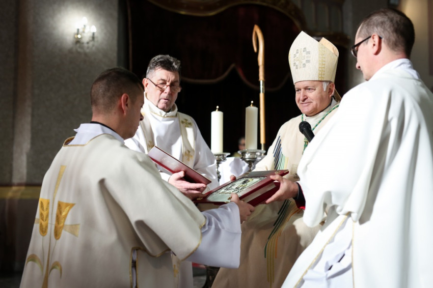 A beöltözés után a felszentelt megkapta szolgálata liturgikus eszközét, az evangéliumos könyvet, melyet a főpásztor a következő felszólítással adott át: „Vedd Krisztus evangéliumát, amelynek hirdetője lettél! Ügyelj arra, hogy amit olvasol, hidd; amit hiszel, tanítsd, és amit tanítasz, kövesd is.”