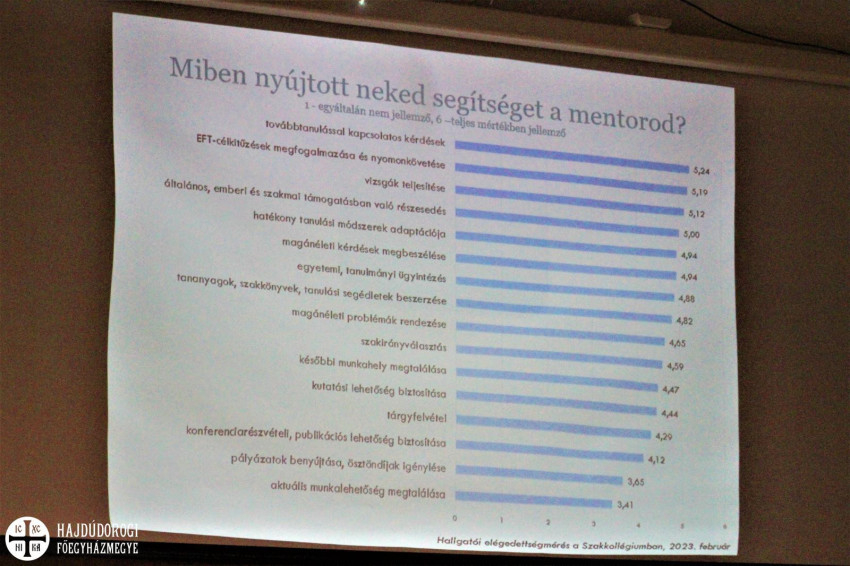 A tanévzáró Szilágyi Eszter tanulmányi vezető előadásával folytatódott, aki az újragondolt mentorrendszerről számolt be. Huszonnégy mentor – köztük dékánhelyettesek, adjunktusok, docensek – havi kétórányi konzultáció keretében segítik a szakkollégistákat az eredményes tanulmányi előrehaladásban. „Olyan egyetemi oktatók ők, akik azokon a karokon tanítanak, ahol az egyetemisták tanulnak. Tíz karról van szó, ami nagyon sok, így a szakkollégium vezetői nem látják át a szakos követelményeket, ezért szükségszerű a mentori segítség – részletezte a mentorok szerepét a tanulmányi vezető. – A célok megvalósulása igencsak szerteágazó, így fontos, hogy valaki irányt mutasson a hallgatóknak az egyetem útvesztőiben.” Míg 30-40 évvel ezelőtt személyes kapcsolat volt az oktatók és diákok között, addig mostanra tömegesedett a felsőoktatás, nincs idő az egyéni konzultációra. A mentorok azonban az egyéni fejlesztési tervek alapján, amelyek rövid, közép és hosszú távú célokat tartalmaznak, hatékonyan tudnak segíteni.