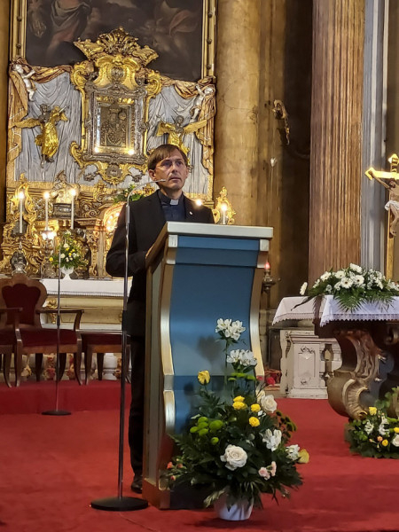A teológiai kar pap tanáraival együtt miséztek a Marosvásárhelyről érkezett jezsuita közösség tagjai, valamint az egyetemi lelkészségen diakónusként egy évig szolgálatot teljesítő, immár pappá szentelt Forró Roland is.