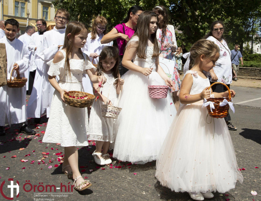 A szentmise körmenettel zárult a plébániatemplom kertjében, ahol négy oltárt állítottak fel az útvonal mentén. A kisgyermekek virágszirmokat szórtak, a hívek imádsággal és énekkel kísérték az Oltáriszentséget.