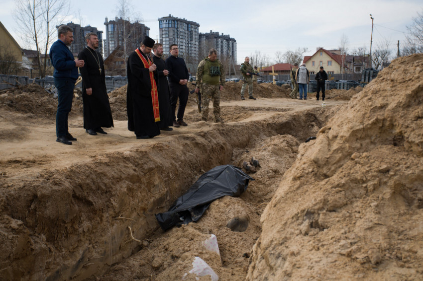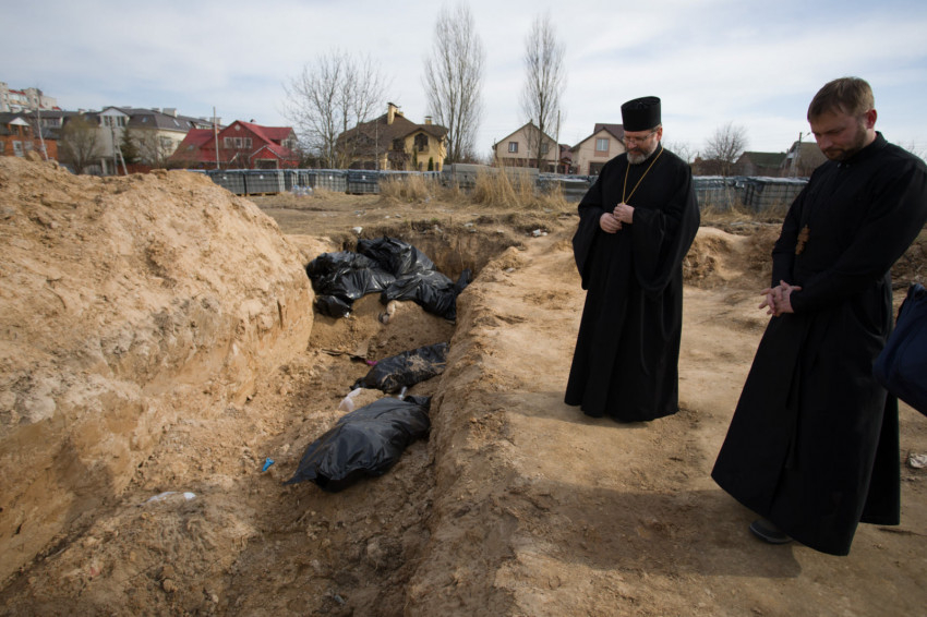 „Bármelyikünk itt lehetne ebben a tömegsírban – mondta. – Az Úristen adjon nyugodalmat ártatlanul meggyilkolt szolgái lelkének, mentse meg az emberi életeket, óvja meg Ukrajnát a gonosztevőktől, akik gyilkolni, fosztogatni és rombolni jöttek ide. A meggyilkolt ártatlanok emléke örökké velünk marad.”