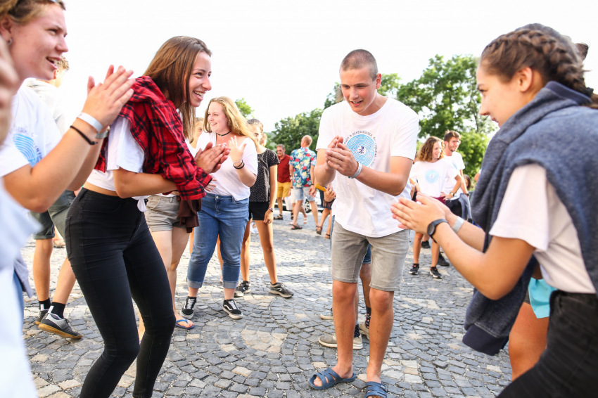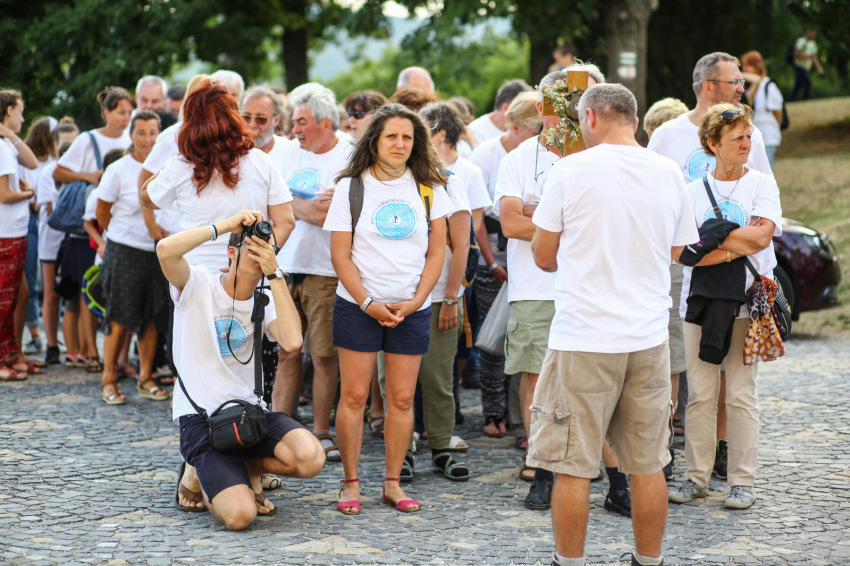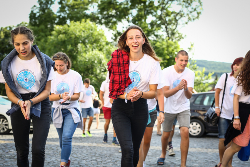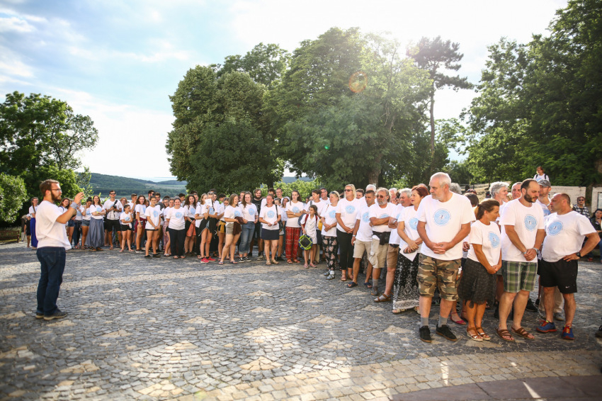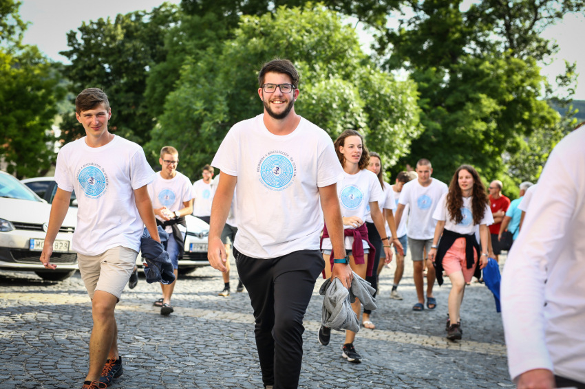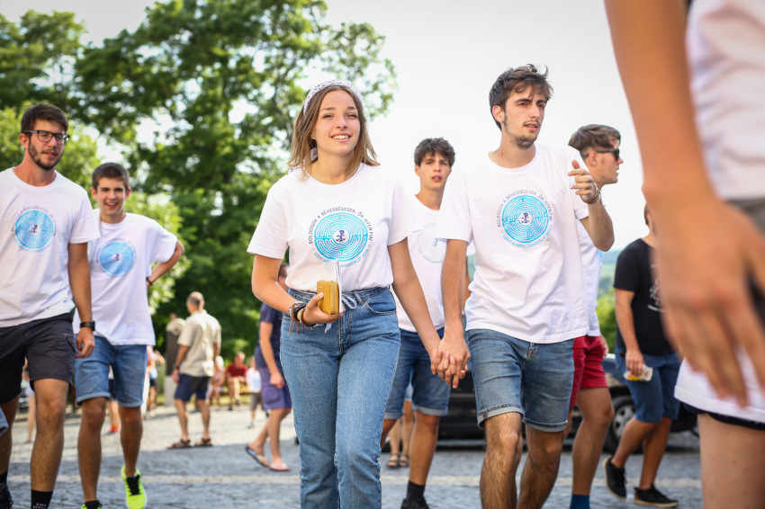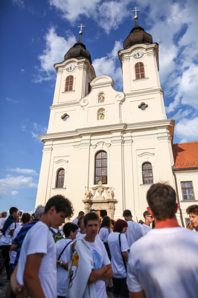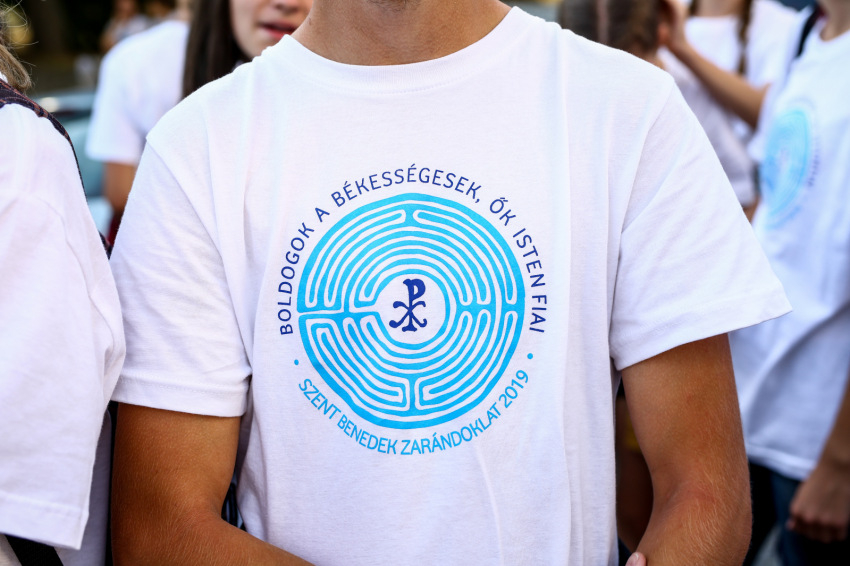 „Boldogok a békességesek, ők Isten fiai – Szent Benedek zarándoklat, 2019” feliratú pólós, éneklő fiatalok színesítik a tihanyi csütörtök délután főként levendulás boltok és kávézók környékén besűrűsödő tömegét. Az apátsági templom felé haladnak az emelkedőn, láthatóan jó kondícióban, noha már hatnapi gyaloglás van mögöttük.
