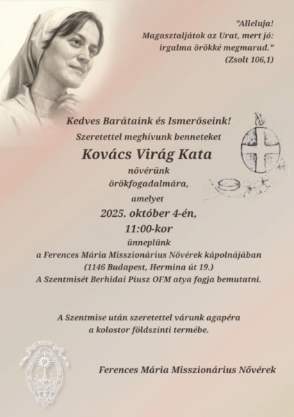 „Az örökfogadalomig tíz éven keresztül tart az alapképzés. A jelöltség időszakában az emberi érettségről, Szent Ferenc életútjáról, az ő lelkiségéről tanulunk. A noviciátusban aztán jobban megismerjük alapító anyánk életét, karizmáját, és nagyon fontos az is, hogy mélyebb lelki kapcsolatot alakítsunk ki Istennel. Ilyenkor elbúcsúzunk a világtól – havonta egyszer levélben tarthattuk a kapcsolatot a szeretteinkkel, telefont nem használtunk, vagyis megvolt ennek a szükséges és egészséges szigora.