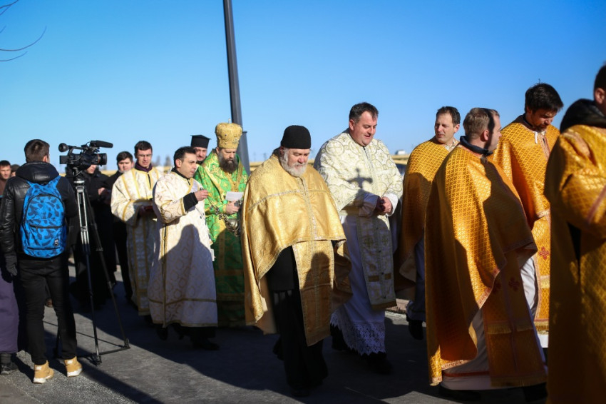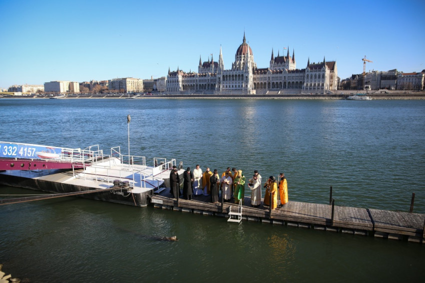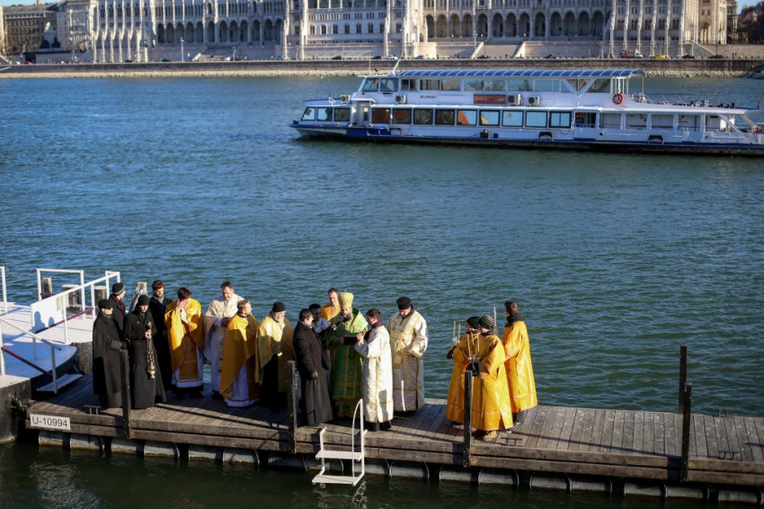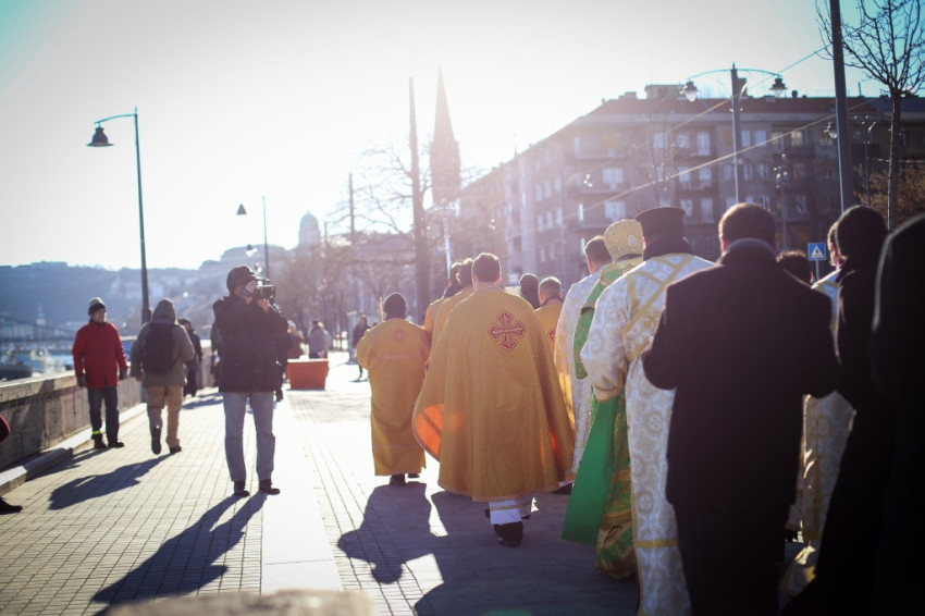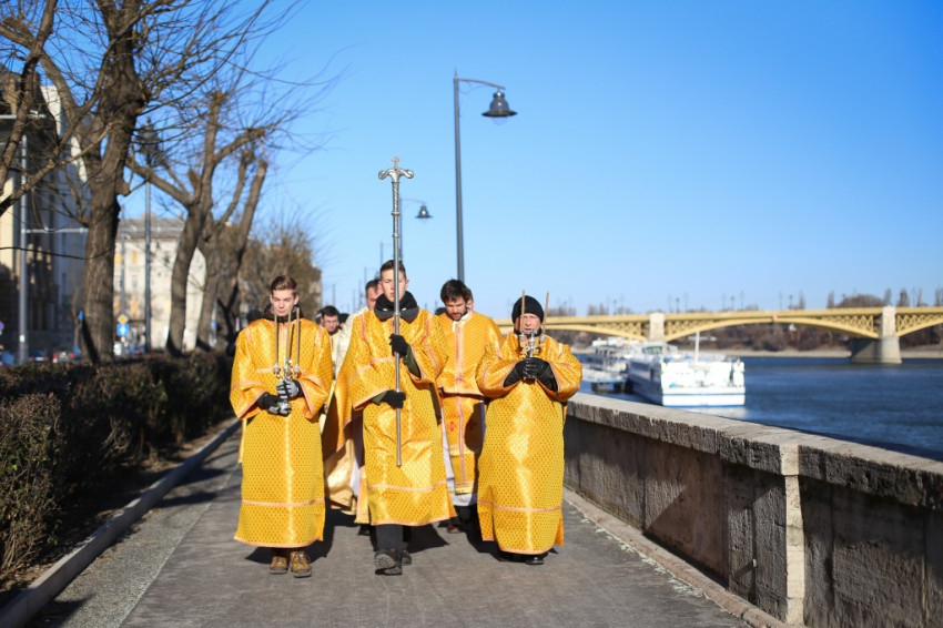 A Szent Liturgiát követően Makláry Ákos, a Budai Görögkatolikus Egyházközség parókusa vezetésével körmenet indult a Dunához. A Bem rakparton végigvonuló százfős menet a Batthyány térnél érkezett a folyópartra. A papság és az asszisztencia az ott található hajókikötőhöz vonult, s egy hosszú stégen állva, a parton álló hívők felé fordulva végezték a vízszentelés szertartását.