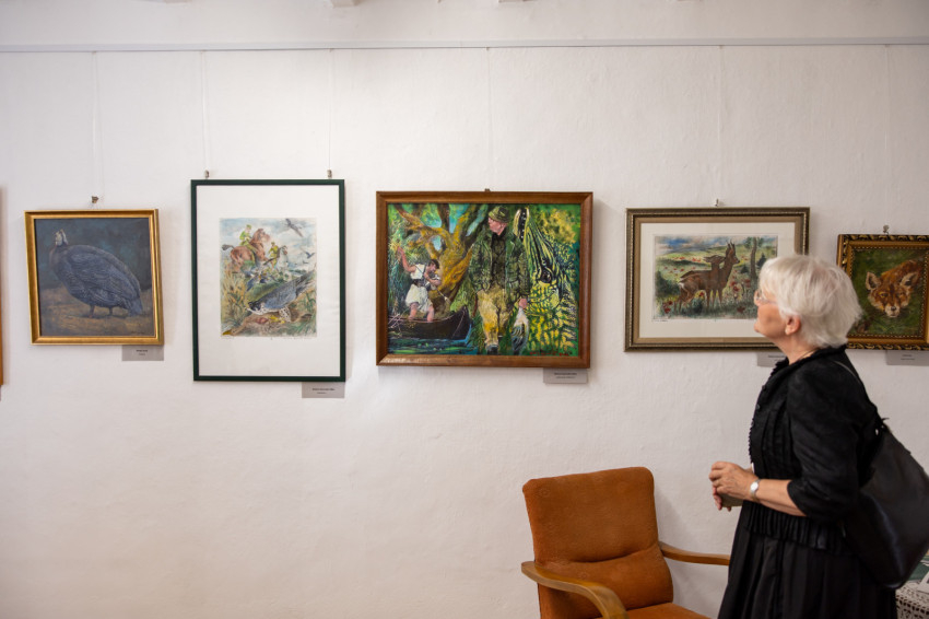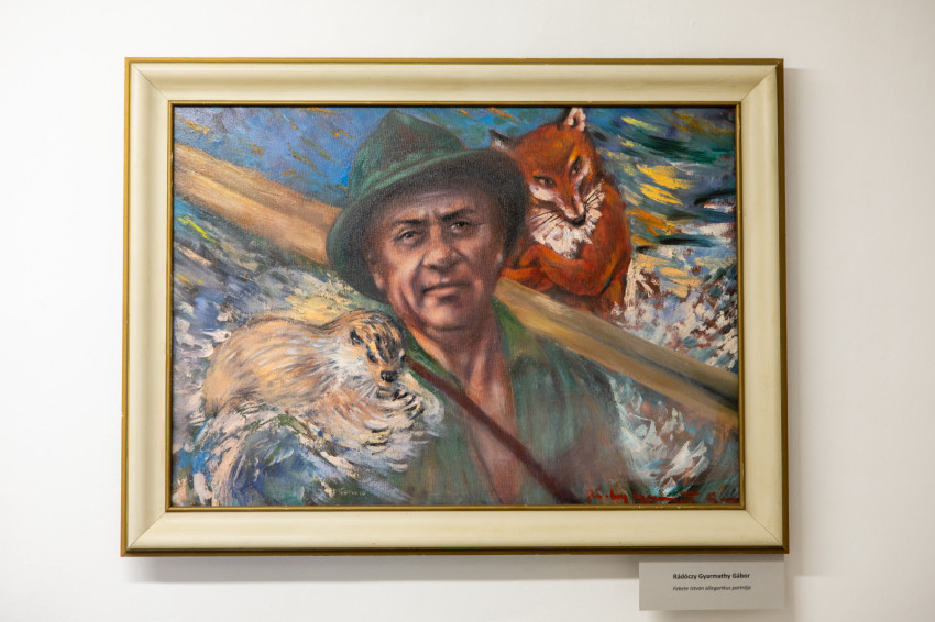 A halászat és vadászat témakörében is bemutatnak kitűnő grafikákat, többek között Szőnyi István, Győri Miklós, Kórusz József rézkarcait. Állatokat ábrázoló kerámiák, kisplasztikák, porcelánfigurák gyűjteményének is otthont ad az emlékház. A galériában látható festmények döntő többsége azonban Rádóczy Gyarmathy Gábor festőművész munkája. „Ő úgy festette meg a vadakat és a vadászjeleneteket, hogy maga is része volt a természetnek. Fiatalon solymászatot tanult, lovagolt, horgászott, vadászott, megfigyelései jó alapot nyújtottak művei létrehozásához. Itt látható a hátsó teremben a vadászat története körképének a vázlata.”