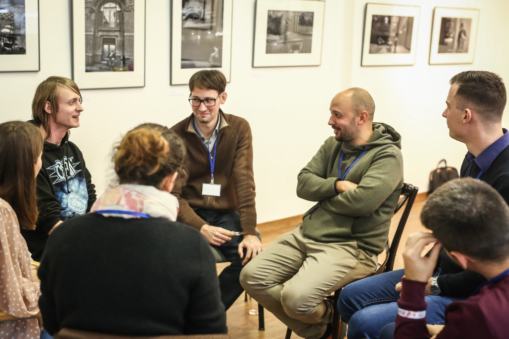 Puchard Balázst és Schön Bálintot pár percre is nehéz kivonni a nap forgatagából, annyira élénk a teremben a beszélgetőkedv. Balázs hangsúlyozza, hogy az önkéntesség gondolata-eszménye nemcsak az egyházak, hanem még a vallásosság határait is átlépi: ahhoz, hogy valaki közösségben másokért akarjon tenni, nem kell vallásosnak lennie.