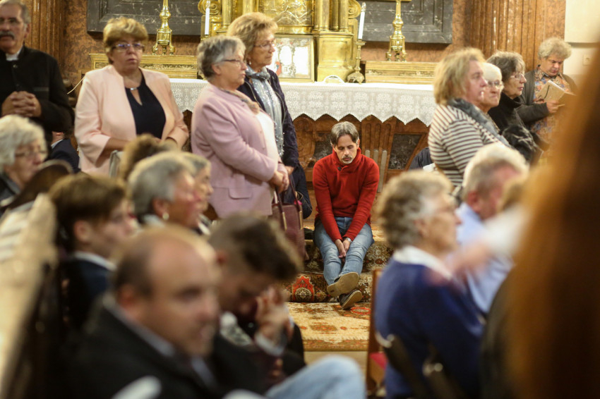 Fél hat után érkezem, előttem két népviseletbe öltözött lány és virágokkal kihímzett fekete pelerint viselő anyukájuk lép be a templomba. Nagyjából minden pad tele van már, de nincs zsúfoltság. Egy oltár melletti korlát aljának párnás szegélyére ülök, amelyet egyébként feltehetőleg az ide imádkozni térdelők szoktak használni. Kissé aggódom, nem tekinti-e valaki ezt tiszteletlenségnek, mert ekkor még csak én merem ezt a forgalomból amúgy kieső helyet választani.