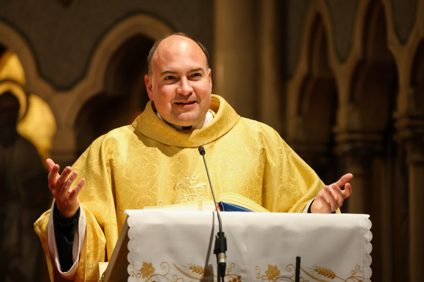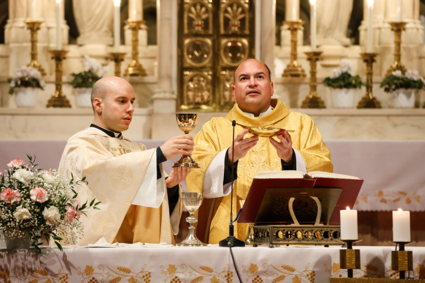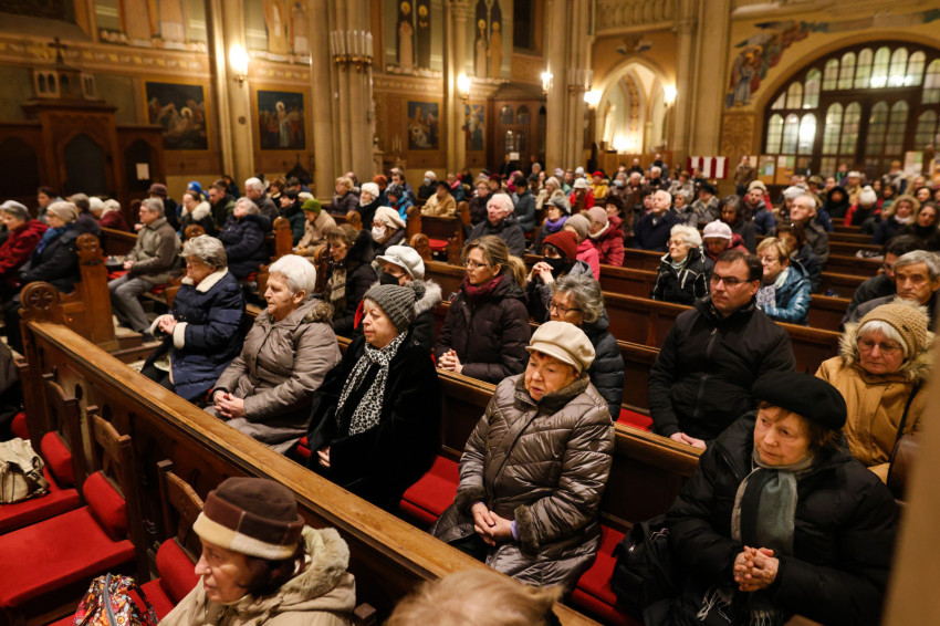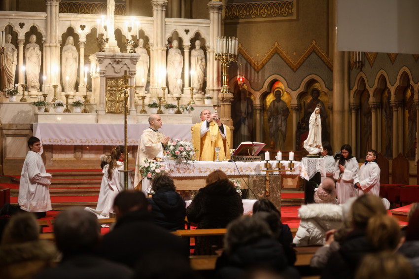 A nagy számban összegyűlt hívek rövid körmeneten vettek részt a templomban, majd Monostori László esperes, a templom plébánosa, az esztergomi Hittudományi Főiskola morálteológia tanára mutatott be szentmisét.