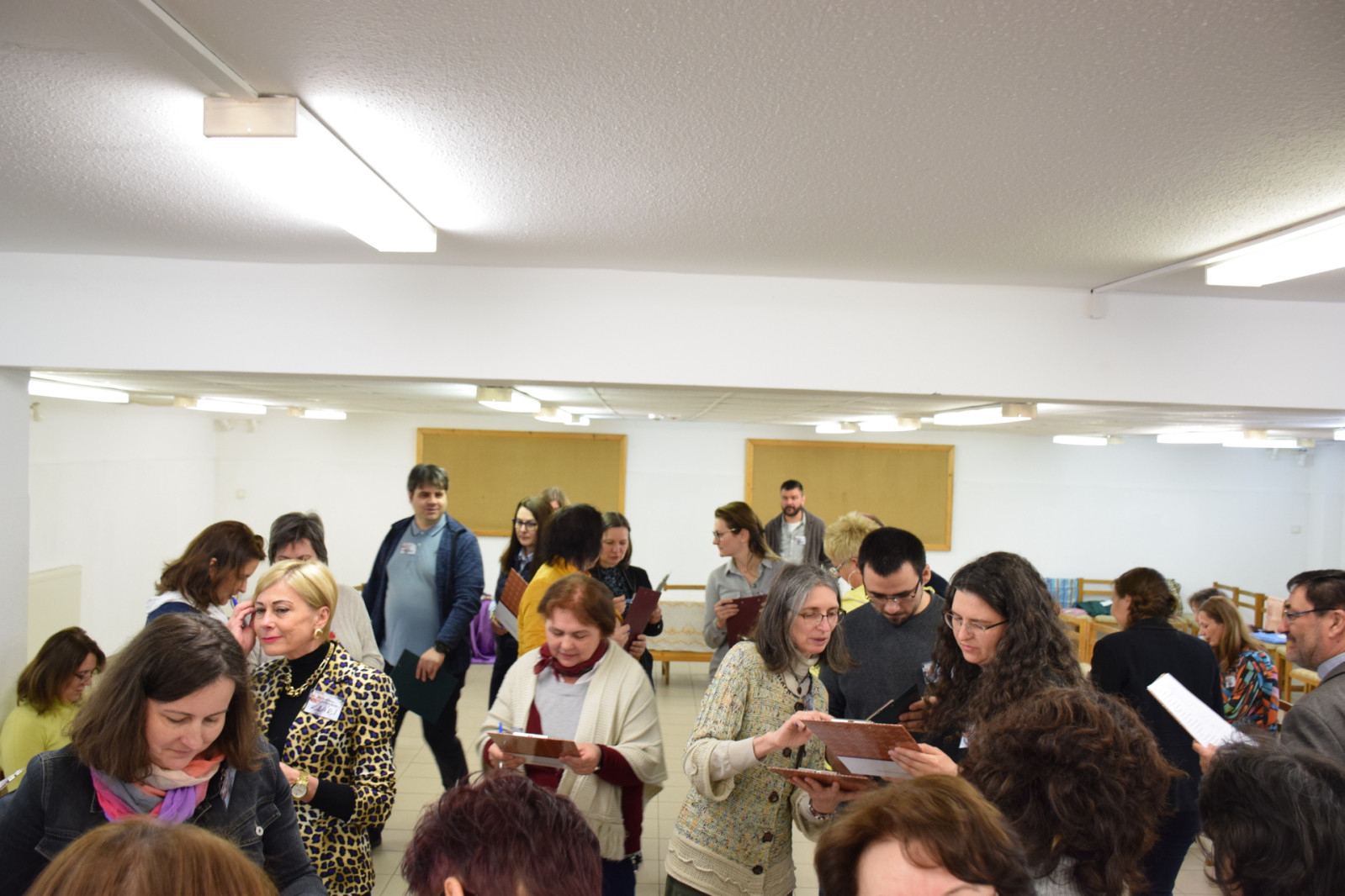 A püspökség több részlegéből, irodáiból érkeztünk. Noha sokszor találkozunk egymással az épületben, a lelkinapot ismerkedő játékokkal kezdtük, hogy az igazán „lényeges” kérdésekben is megismerjük egymást: ki a balkezes, ki főzött tavaly lekvárt, ki épített már homokvárat, kinek milyen hosszú a haja vagy mekkora a cipőmérete?