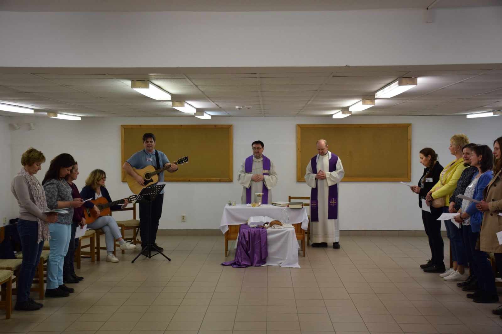 Végül közös szentmisén vettünk részt, amelyet Kondé Lajos és Serfőző Levente helynök atyák tartottak. A János evangéliumában feltűnő 38 éves, beteg ember történetéhez fűzte hozzá a prédikációban Levente atya, hogy Isten nem nélkülünk cselekszik, hanem velünk együtt. A szentmisén együtt, énekekkel dicsértük az Urat, gitáros kísérettel.