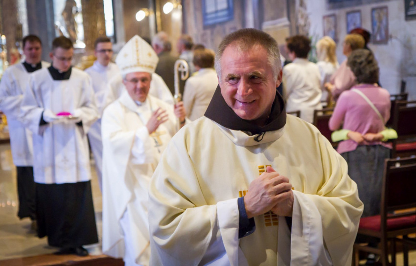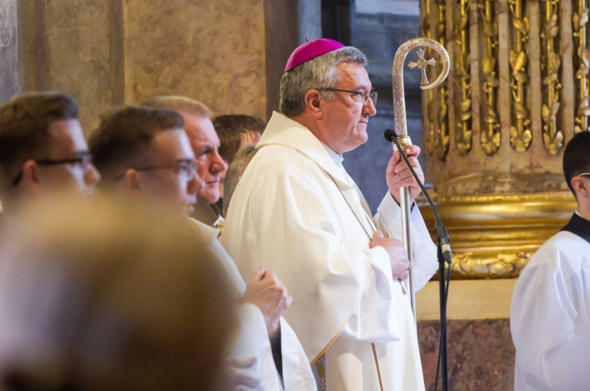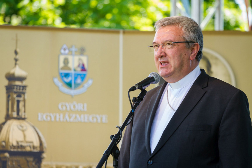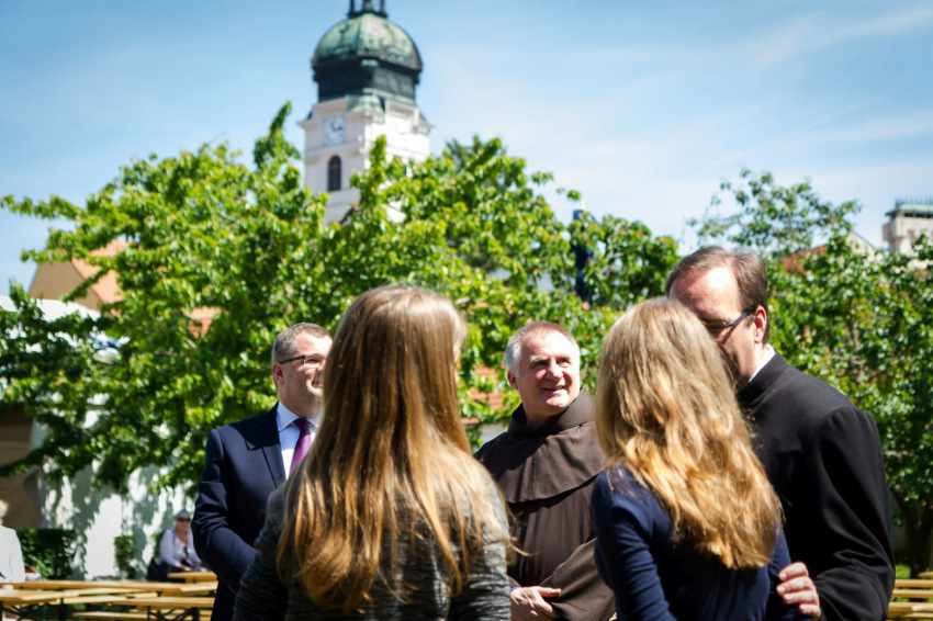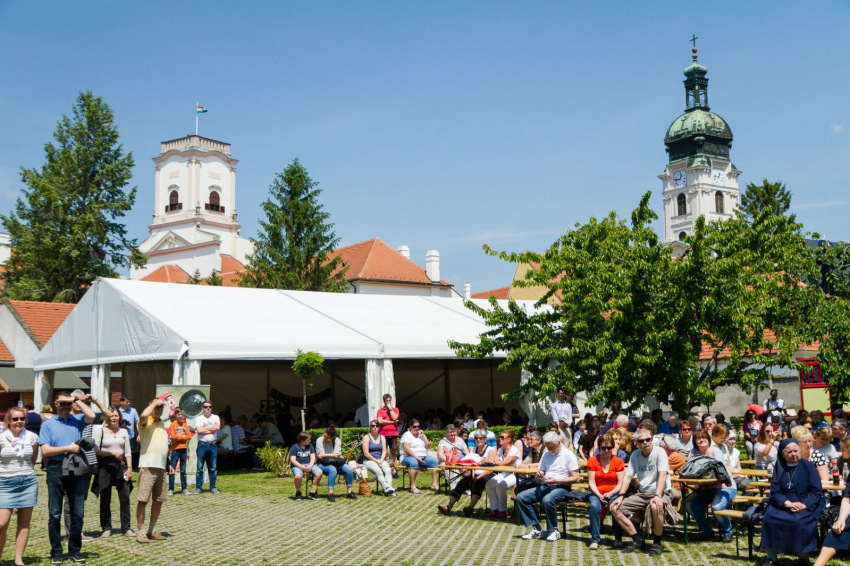 A mise végén Veres András a püspökség udvarára invitálja a megjelenteket. Számomra pedig elérkezik a pillanat, hogy az énekkarral megismerkedjem. Szabó Balázs színész, akit először megszólítok, először szerényen Zseni Anikóhoz irányít, aki elmondja, hogy Győrújfaluból érkeztek: ők az ottani római katolikus plébánia ének- és zenekara, Az Öröm Hírnökei. Tíz éve alakultak, havonta egyszer zenélnek a misén, minden tagjuk képzett zeneileg. Balázs három-négy évvel ezelőtti csatlakozása sokat jelentett számukra zenei-előadóművészi profizmusa miatt, akárcsak azon a téren, hogy a szakrális szolgálaton túlra is kiterjesszék a tevékenységüket. Népdalokat is feldolgoznak. A Tavaszi szél vizet áraszt Balázs és szerzőtársa, Rapkay Tamás által újragondolt változata szerepelni fog a Győrújfaluról készülő imázsfilmben, amely ősszel jelenik meg. Ma délután még lesz egy koncertjük odahaza, amelynek bevételét a halmozottan sérült gyerekeket nevelő családok támogatója, a Hétszínvirág Egyesület javára ajánlják fel. Amikor odakint sikerül Balázst mégiscsak szóra bírnom, azt mondja: szerinte a szívek együttrezgése és a lelkesedés a titkuk, na meg az egyre több próba, amelyekre a koncertfelkérések szaporodása rá is kényszeríti őket. Jól kiegészítik egymást a kar vezetésében: Anikó a teológiai, ő a zenei felelős.