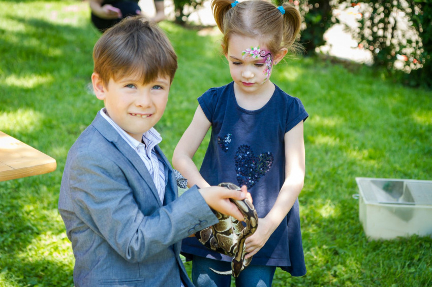 A színdarab után a győri Liszt Ferenc zeneiskola fúvószenekarának koncertjét konferálja be a műsorvezető hölgy, de az csak valamivel később kezdődik majd. A gyerekeket addig is várják a kincsesműhelyben és a miniállatkertben, ahol sok más mellett egy aranyos patkányt (!) lehet simogatni. Azt hiszem, itt válik nyilvánvalóvá, hogy ez itt a tökéletes szeretetnap, hiszen ha van rettenetesen rossz hírű állat, a patkány az, itt viszont még ő is aranyos, szeretgetni való! Elsétálok az állatsereglethez, és megnézem, milyen állatok a legdédelgetettebbek. Érdekes módon egy öreg agáma (gyíkszerű állat) a favorit. Noha majd szétszedik, mindent eltűr, mindent elvisel. A királypiton is népszerű, meg egy süni iránt érdeklődnének még sokan, de ő éppen összegömbölyödve piheg egy sarokban: talán neki már túl sok volt mára a szeretetből.