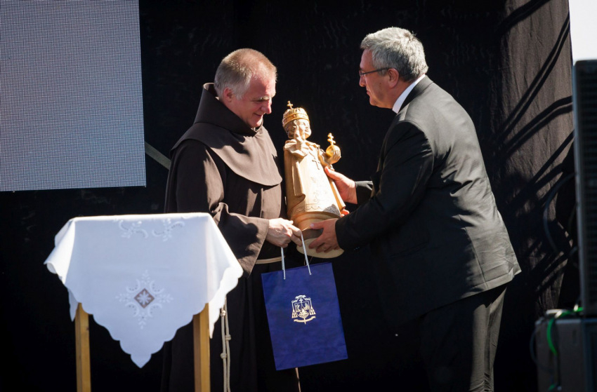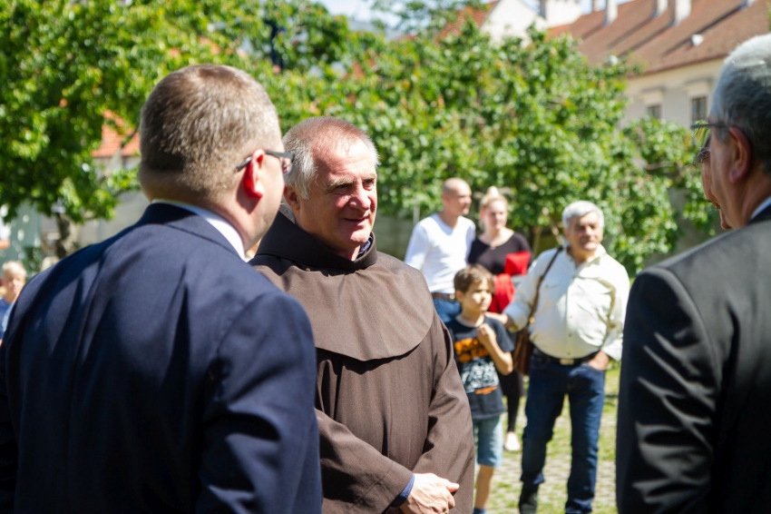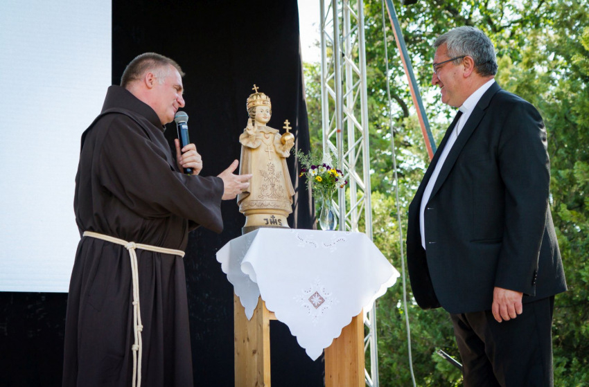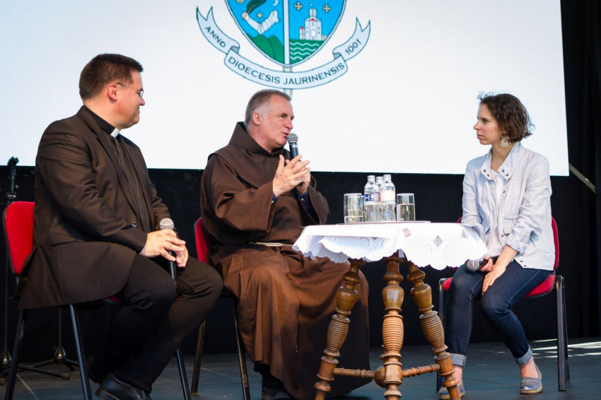 Szívesen sétálnánk még, de nemsokára beszélgetés kezdődik Böjte Csabával, ezért visszasietünk a kertbe: Várkonyi Borbála, a Nemzetközi Eucharisztikus Kongresszus titkárságának munkatársa (az egyik volt kolléganőm) és Kálmán Imre, a győri Brenner János főiskola prefektusa kérdezi az atyát. Az első kérdés a gyermek Jézus tiszteletére vonatkozik, abból adódóan, hogy Csaba magával hozott egy általa csináltatott, Jézust gyermekként, mégis királyként ábrázoló szobrot, amelyet most Veres Andrásnak ajándékoz. Ugyanilyet fog kapni a pápa körülbelül egy hét múlva Csíksomlyón. „Miért csak szakállas embereket látni a templomi képeken?” – kérdezgették a gyerekek Csaba testvért, és ez ráébresztette, hogy nem szabadna az ünnepeinknek csak felnőtteknek-felnőttekről szólniuk. Hiszen Jézus is kergetődző-bújócskázó gyerek volt egy ideig. Jó lenne a gyermeki lelkületet erősebben jelenvalóvá tennünk a mindennapjainkban, a templomainkban, a prédikációinkban. Hogy annyira nagy bizalommal lehessünk az Isten iránt, mint a gyerekek irántunk.