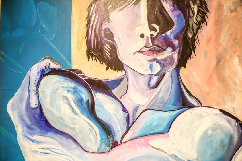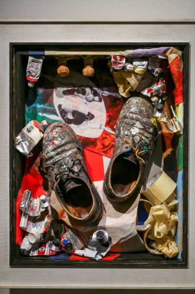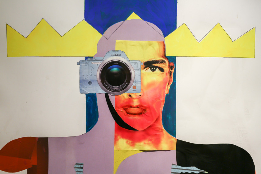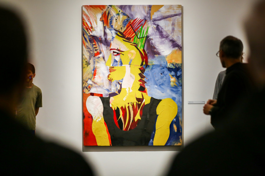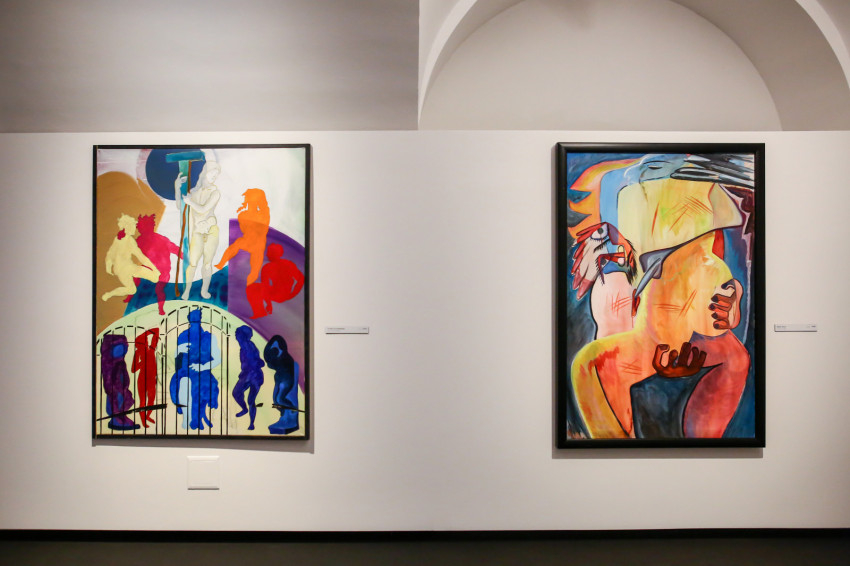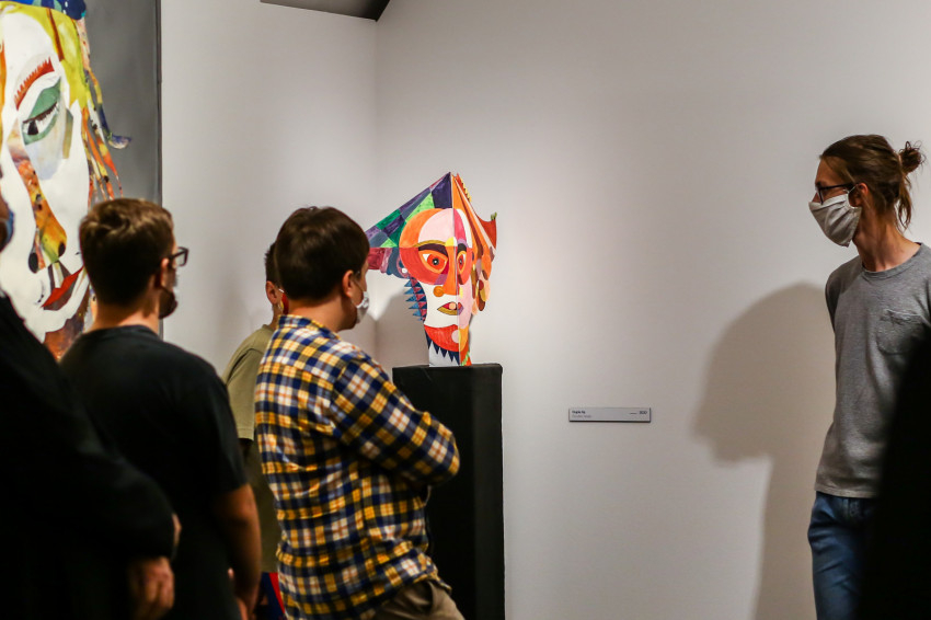 Ezen a kiállításon nem lehet gyorsan áthaladni, ha szeretnénk megérteni, mit látunk. Szemek és arcok fogadják a látogatót, karneváli színes forgatagban. Mellettük a művésszel készült videointerjúból láthatunk részletet, melyben arról beszél: