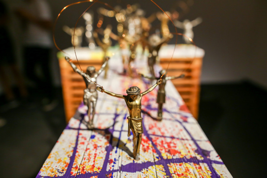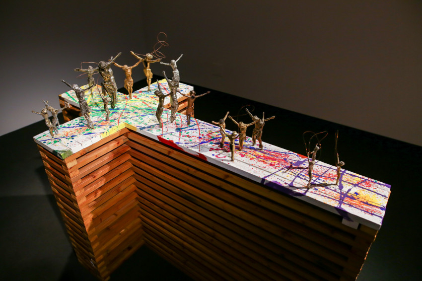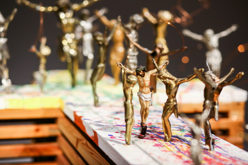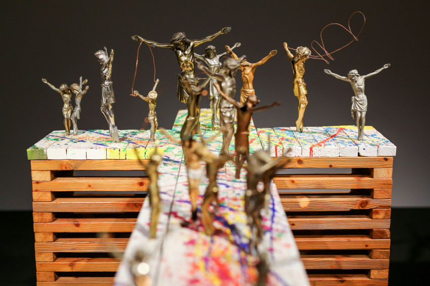 E kívánság művészi megfogalmazása a kiállítás emblematikus alkotása, mely Szent Ágostont idézve ezt a címet viseli: Krisztus, az élet előtáncosa. A kereszt alakú táncparketten feszületekről levett korpuszok táncolnak, forognak, hajladoznak, ugróköteleznek. Mindez nem polgárpukkasztás vagy blaszfémia: a keresztről levett és élő Krisztus a feltámadásba vetett hit legmélyebb kifejezése.