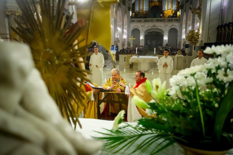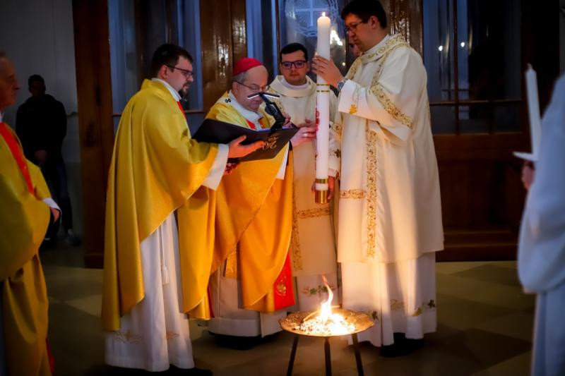 A székesegyház előtt a főpásztor megáldotta a tüzet, melynek lángjával meggyújtották a Jézus élettelen testét szimbolizáló húsvéti gyertyát. A püspök és az asszisztencia csendben vonult be a húsvéti gyertyával a templomba; közben háromszor felhangzott a Megváltó feltámadott életét ujjongva hirdető ének – „Krisztus világossága! Istennek legyen hála!” –, és felgyulladtak a templom fényei. Az Exultet és az olvasmányok után felhangzott a Glória, megszólaltak a székesegyház harangjai, az orgona és a templom csengői, hirdetve a feltámadás örömhírét. A szentlecke után pedig újra felhangzott az Alleluja.