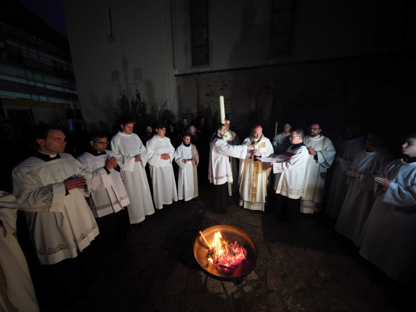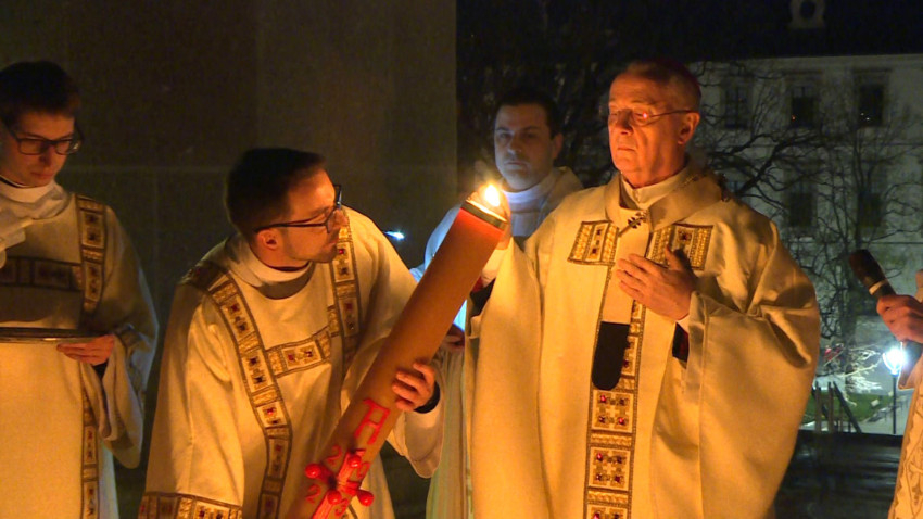 A húsvéti vigíliaszertartás a szombathelyi székesegyház előtt a tűzszenteléssel kezdődött. Ezt követően Székely János megyéspüspök és az asszisztencia a húsvéti gyertyával – Krisztus világosságával – bevonult a templomba.