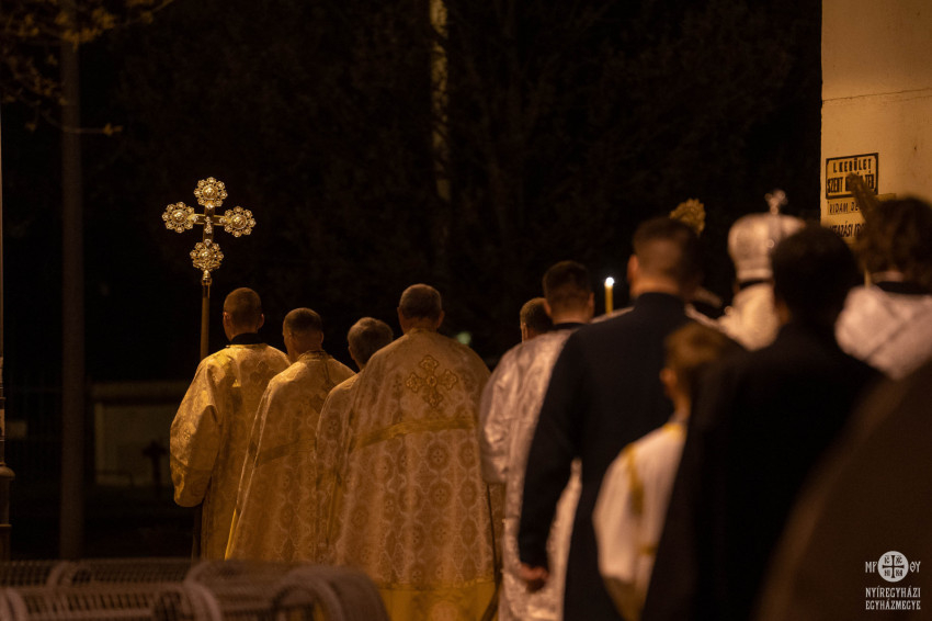 A síri lepel még a sötétségben a Szent Sírból az oltárra került, majd a főpásztori gyertyájából merítve fényt körmenetre indultak a templom körüli téren, a feltámadási tropárt énekelve: „Midőn leszállottál a halálhoz, halhatatlan Élet, / akkor megtörted a poklot Istenséged fényével; / s midőn a holtakat is a mélységből föltámasztottad, / minden mennyei Erők örvendezve kiálták: / Életadó Krisztus Istenünk, dicsőség néked!”