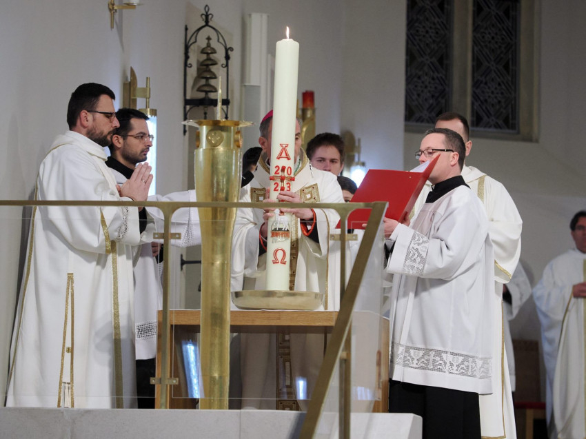 Nagyszombat este Varga László megyéspüspök mutatott be vigíliaszentmisét a kaposvári Nagyboldogasszony-székesegyházban. A szertartás a tűzszenteléssel kezdődött, majd a papság és az asszisztencia a húsvéti gyertya, Krisztus világossága fényénél vonult a szentélybe.