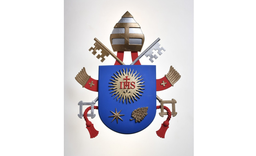 A kék pajzs fölött a pápai méltóság szimbólumai kaptak helyet, ugyanazok, amelyeket elődje, XVI. Benedek pápa is használt (a mitrán, azaz a püspöksüvegen keresztbe tett arany- és ezüstkulcs, amelyeket vörös zsinór köt össze). A pajzson a pápa szerzetesrendjének, a Jézus Társaságának (jezsuiták) emblémája látható: sugárzó nap, amelyen vörössel az IHS betűk, Jézus monogramja látható. A H betűt kereszt koronázza; a betűk alatt három fekete szög van.
