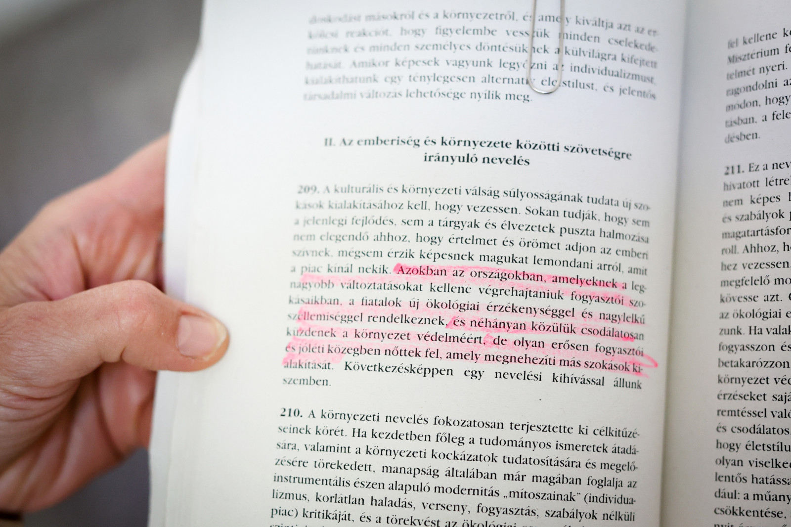 Létezik ökológiai lelki tükör is, olyan kérdésekkel, mint például hogy vasárnap a templomban voltam vagy vásároltam. Ma a plázák a fogyasztás templomai. Ha az imádság, a szemlélődés az alap az életemben, és rá tudok csodálkozni a világra, akkor nem lesz olyan hiányérzetem, amit a fogyasztással próbálok ellensúlyozni. A fogyasztás igazából soha nem lesz alkalmas a hiány betöltésére, mindig csak egyre több fogyasztást szül.