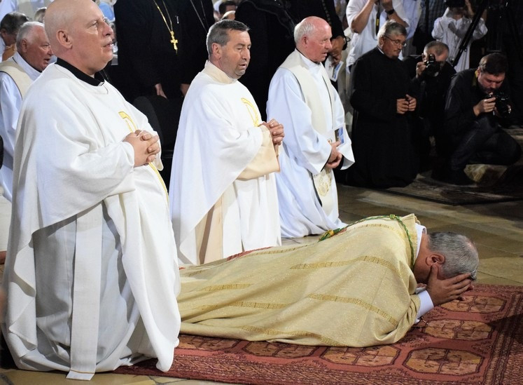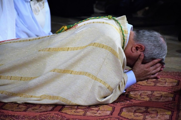 A Mindenszentek litániája alatt a szentelendő leborult a földre, míg mindenki térdelve imádkozott. Ezt követően valamennyi jelen lévő püspök – a főszentelő után – kezét a szentelendő fejére tette; majd a főszentelő nyitott evangéliumoskönyvet helyezett a szentelendő feje fölé, és elmondták a szentelési imádságot: „Most tehát áraszd e kiválasztottadra azt az erőt, amely tőled származik: a vezetés Szentlelkét, akit megadtál Jézus Krisztusnak, szeretett Fiadnak, ő pedig odaajándékozta szent apostolainak, akik Egyházat szerveztek szerte a világon, hogy az legyen a te szentélyed, és nevedet szüntelenül dicsőítsük és áldjuk benne.”