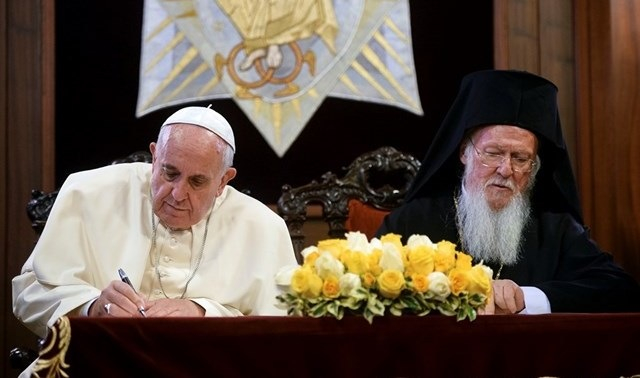 Májusi jeruzsálemi találkozásunkkor, amikor megemlékeztünk tiszteletreméltó elődeink, VI. Pál pápa és Athenagorász ökumenikus pátriárka történelmi öleléséről, közös nyilatkozatot írtunk alá. Ma, egy újabb testvéri találkozás örömteli alkalmából, ismételten le akarjuk szögezni közös szándékainkat és aggodalmainkat.