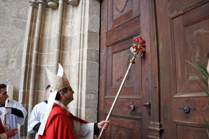 A székesegyház bejáratához érkezve a segédpüspök a körmeneti kereszttel háromszor megzörgette az ajtót, jelezve Krisztus, a dicsőség királyának bevonulását Jeruzsálembe: „Emeljétek föl fejeteket, kapuk, ősi kapuszárnyak, táruljatok, hadd vonuljon be a dicsőség királya!” (Zsolt 24,7).
