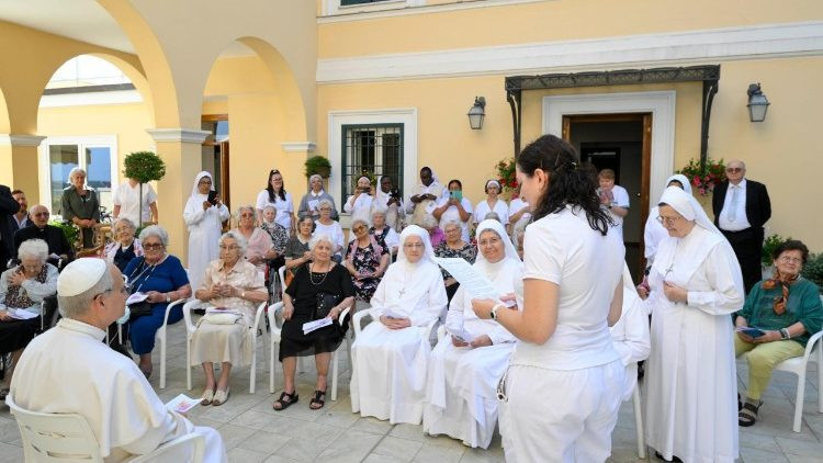 Boldog és mosolygós, 80 és 101 év közötti idős hölgyek fogadták Leó pápát a Szent Márta nővérei kongregáció tagjaival, rendfőnöknőjével együtt. Miután egy fiatal ápolónő üdvözölte, együtt imádkoztak, énekeltek, majd a pápa az énekek szavairól és a vasárnapi evangéliumról beszélgetett velük. Lukács evangéliuma Jézus látogatásáról szólt Márta és Mária házában, „és ma itt vagyok Betániában, a Szent Mártában” – viccelődött.