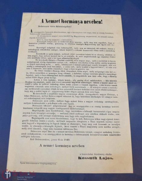 A Déri Múzeum kupolatermébe lépve kiemelt helyen látható az 1849. január 6-án keltezett, és január 7-én a sajtóban is megjelent kiáltvány. Benne Kossuth lelkesen ír a magyar szabadság kivívásáról, hangsúlyozva ebben a város szerepét: „Debreczen azon szikla, mellyre fogja építeni Isten a magyar szabadság szentegyházát, mellyen diadalmaskodni a pokolkapui soha sem fognak. Ime én a nemzet nevében Debreczen városát, a magyar szabadság őrvárosának nyilatkoztatom...”