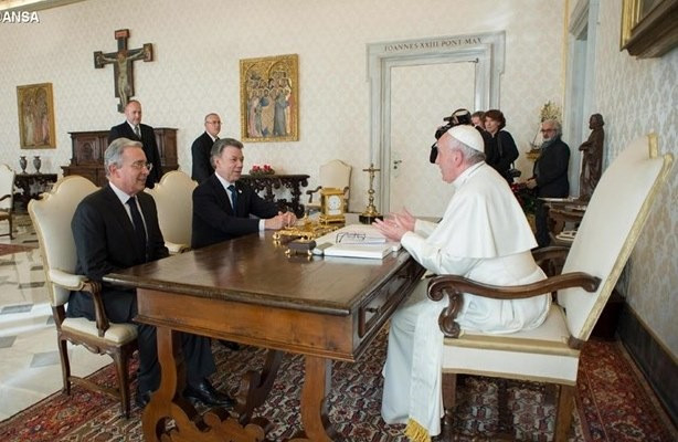 A szentatya ezt követően találkozott Álvaro Uribe Vélez szenátorral, Kolumbia korábbi elnökével, Santos elnök legnagyobb kritikusával. Először magánkihallgatás keretében beszélt a korábbi kolumbiai elnökkel, majd Santos elnökkel együtt. A pápa szólt a találkozás kultúrájáról, és kiemelte, hogy fontos a kolumbiai társadalom minden szereplője közötti őszinte párbeszéd ebben a történelmi pillanatban – tájékoztat a pápai audienciáról kiadott szentszéki közlemény.