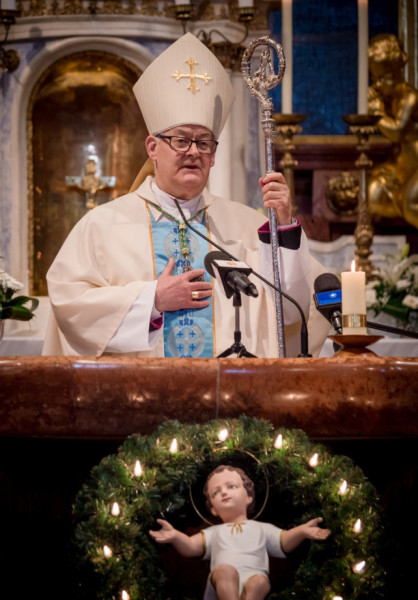 „Krisztus nevében adtunk hálát az elmúlt évért, Krisztus nevében fogadjuk el ajándékként az új esztendőt a mennyei Atyától, és ajánljuk Isten Anyja oltalmába. Mély hittel tekintünk a Gyermekre mint Isten Fiára, akit Mária szült. Ez az alapja küldetésünknek, hogy a hit, a remény és béke emberei legyünk ebben a békétlen és hitetlen világban” – fogalmazott homíliájában a főpásztor.