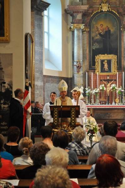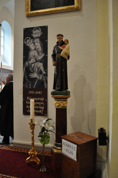 A vesperást követően, 17 órakor került sor az ünnepi szentmisére, amelyet Majnek Antal munkácsi megyéspüspök mutatott be tíz paptársával együtt a kegytemplomban; Srankó László plébános üdvözölte a szentantali egyházközség vendégét.