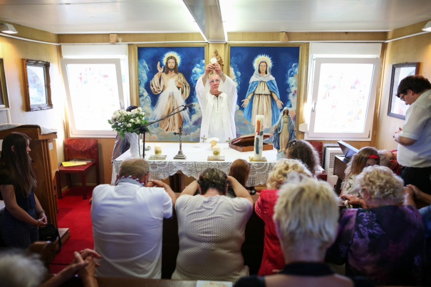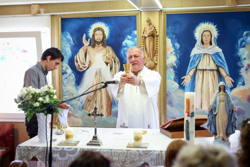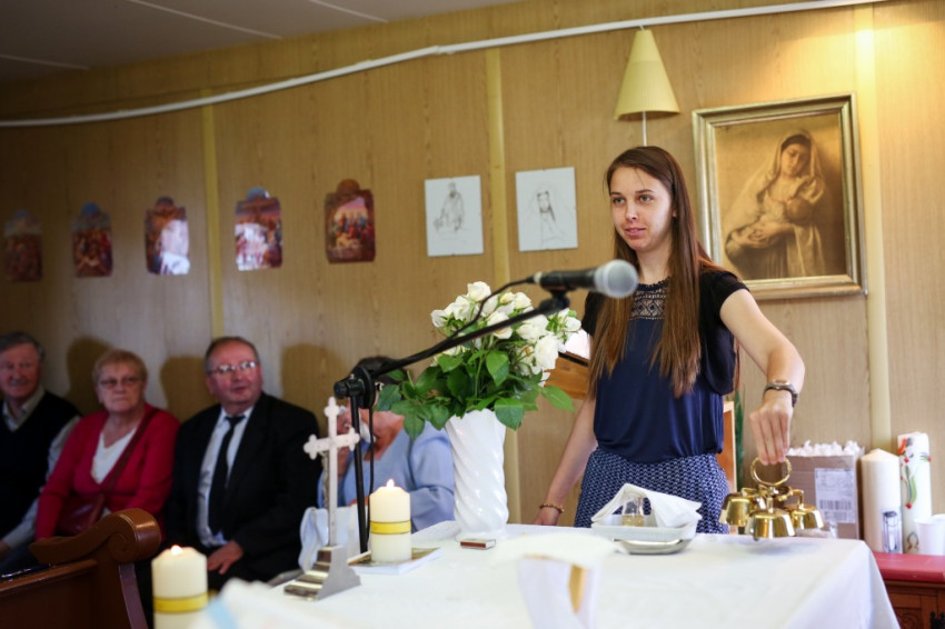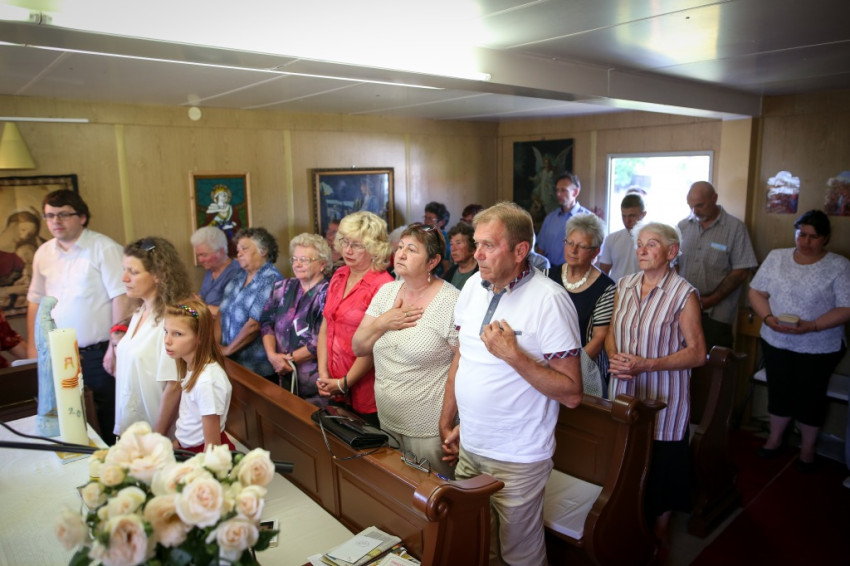 Jóval a misekezdet, öt óra előtt megtelik a templom, a további érkezők már csak kint ülhetnek le. A polgármester rövid időre távozik, majd ünneplőben visszatér, és üdvözli az egybegyűlteket. Kedvcsinálóként elmeséli azt az élményét, amikor Beer Miklós mise közben arra kérte a padokban ülőket, hogy vele együtt álljanak fel, hagyják el a templomot, majd térjenek vissza. Éljék át, hogy a kereszténynek küldetése van, a temploma „csak” bázis. A konténertemplom ajtaja, ablakai nyitva, és kint is vagyunk legalább tízen-tizenöten: a természet hangjai beszűrődnek, kint és bent összefolyik, hat egymásra.