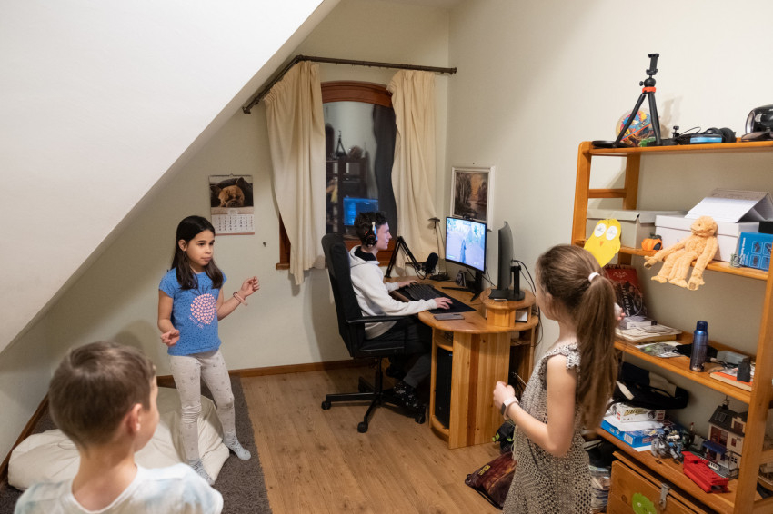 Érd, kertes házas környék. A frissen aszfaltozott utcán – mint később kiderül – éppen Réka és Balázs gyerekei gördeszkáznak, görkorcsolyáznak. A kertkapun egy kis tarka cica mászik át. A bejárati ajtó előtt egy négyzetmétert is elfoglalnak a szépen elrendezett papucsok, szám szerint kilenc pár. Az étkezőben a hatalmas asztal körül a székek nem mind egyformák. A friss aszfalt kipróbálása után a játékban kimelegedett gyerekek bejönnek, együtt vonulnak föl a hálószobák szintjére, aztán le, a nappaliba. Egy perc sem telik bele, már a konyhában vannak. Édességet hoznak; előbb minket is megkínálnak belőle, aztán kivonulnak a kertbe a finomságokkal. A nagyok a saját dolgaikkal foglalkoznak az emeleten, a középső gyerek, Samu fociedzésen van. A legkisebbnek, Dórinak mozog a tejfoga, így beszélgetésünk alatt időnként ellenőrizni kell, megvan-e még.