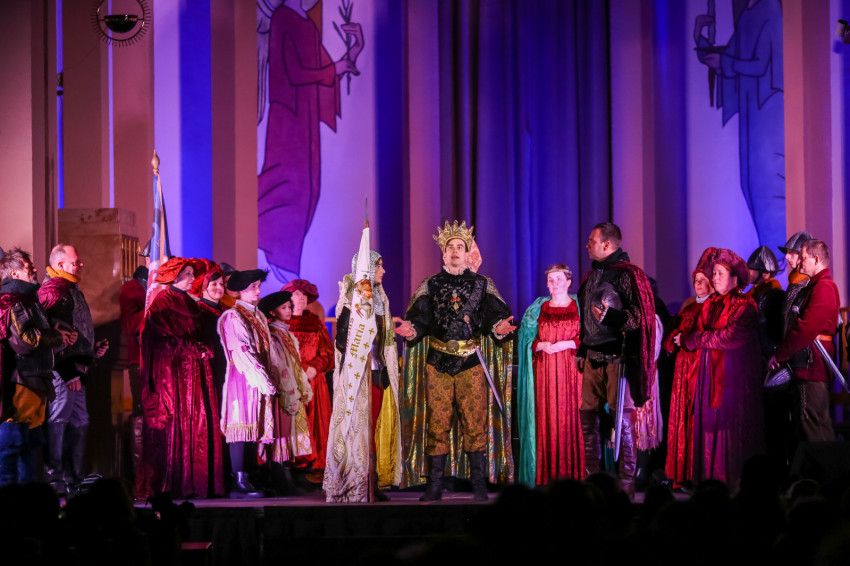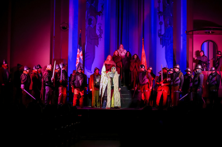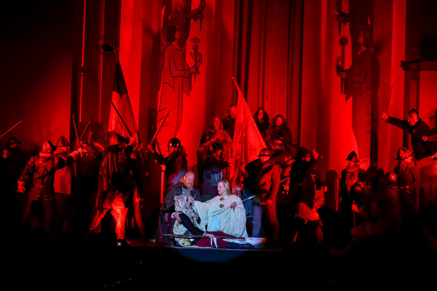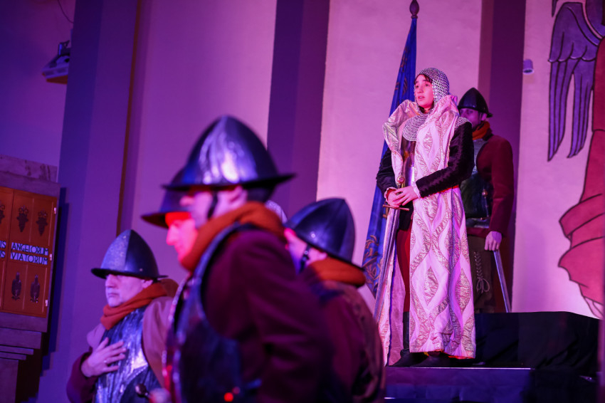 A misztériumjátékot mintegy hatvan szereplő adja elő. Meskó Zsolt eredeti ötlettel megkettőzi Jeanne d’Arc személyiségét: az első Jeanne a cselekvő, míg a második mintha a mából emlékezne vissza a történtekre, üdvözült lélekként. A cselekvő Jeanne-t a tizenkilenc éves Ménesi Júlia játssza, nagy átéléssel. Elhisszük neki, hogy valóban Isten áll mögötte, az Úrból meríti erejét, minden mozdulata, hanghordozása hiteles. A visszaemlékező Jeanne hangja az ugyancsak tizenéves Meskó Borókáé. Érthetően, tisztán beszél, nem hadar, nem harapja le a szavak végét, úgy értelmezi a történteket, hogy minket is gondolkozásra késztet. A darab végén fölteszi a kérdést: „Uram, hallják még a hangodat? Uram, hallják még a hangunkat?”