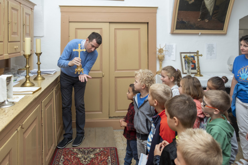 Az „Énekelj az Úrnak…” állomáson egy ismert ének (Ez a templom, ez a tornya…) valamennyi versszakát megjelenítő képek sorba rendezése és közös éneklése volt a feladat. A „Színes ablakok” állomáson díszes, színes ablaküveg színezésére volt lehetőség. A „Találd ki?” játék a sekrestyében zajlott Fekete Zoltán káplán atyával. Az oltáron található eszközök, tárgyak felismerése, azok megnevezése volt az egyik feladat, majd következtek a találós kérdések, melyek szintén a templomhoz, az ott szolgáló emberekhez kapcsolódtak.