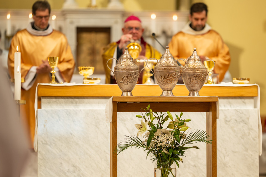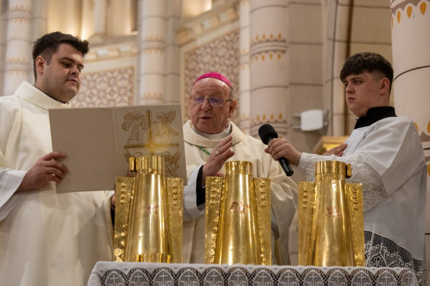 Nagycsütörtök délelőtt Veres András megyéspüspök olajszentelési szentmisét mutatott be a Győri Egyházmegye papságával a győri Nagyboldogasszony-székesegyházban. A főpásztor a szentmise keretein belül megszentelte a keresztelendők és a betegek olaját, valamint a krizmát. Az ünnepi szertartás során a papi ígéretek megújítására is sor került.
