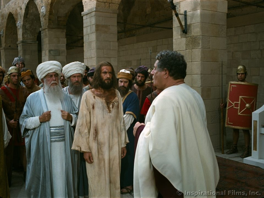 Röviden, de nagy drámai erővel van ábrázolva Jézus passiója, kezdve a zsidó főtanács előtti kihallgatástól. Jézust többször is durván bántalmazzák, még Heródes Antipász is megvereti. A negyedes fejedelem itt nem pojácaként van ábrázolva, hanem öntelt zsarnokként, aki kíméletlenül megtorolja a vele szembeni legkisebb ellenszegülést is. Hozzá hasonlóan kegyetlen jellem Pilátus helytartó, kövér, elpuhult figura, akiről elhisszük, hogy szívfájdalom nélkül mészároltatott le békés galileaiakat, áldozathozatal közben, ahogy azt az evangélium írja (13,1).
