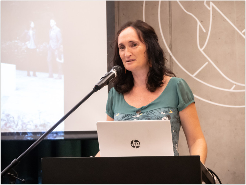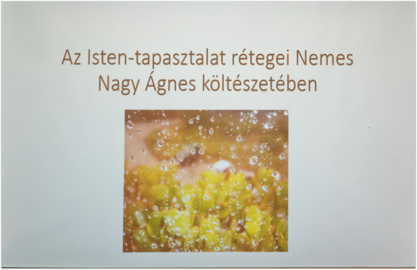 Az előadás témáját bemutatva Hernádi Mária beszélt Nemes Nagy istentapasztalatának rétegeiről, és utalt rá: valószínűleg már mindannyian tapasztalhattuk, hogy nem deklaráltan vallásos művek is tudnak közvetíteni Isten és ember között. Nemes Nagy Ágnes református családjából hozott magával egy vallásos műveltséget, de a személyes útja máshogy alakult.