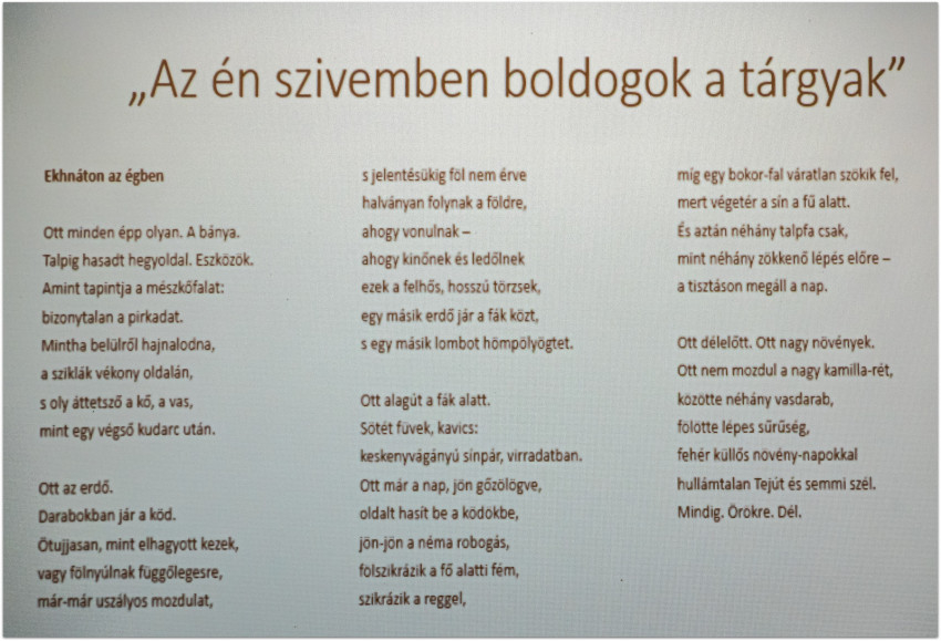 Az előadás következő egységének címe a sokszor idézett sor volt: „Az én szívemben boldogok a tárgyak”. Már az Ekhnáton-ciklus csúcspontja is ide mutat: a felkelő nap a tárgyakban válik jelenvalóvá (Ekhnáton az égben). Ekhnáton számára az érzékelésre való rátalálás mutat kiutat a zsákutcából (A tárgyak, A tárgy fölött). Mint Hernádi Mária fogalmazott: „…az elme megreked, a lélek csendben elindul hazafelé”; az összeférhetetlen rétegek mégis összeférnek.