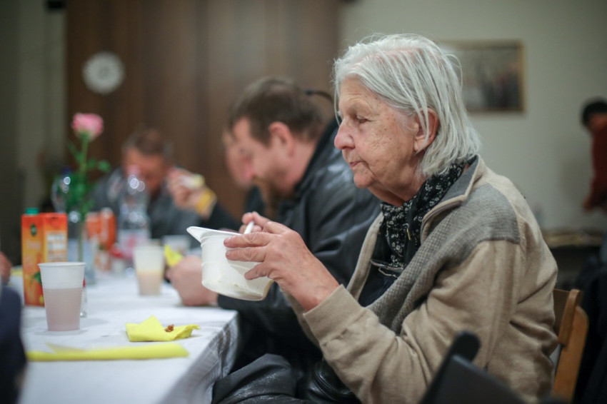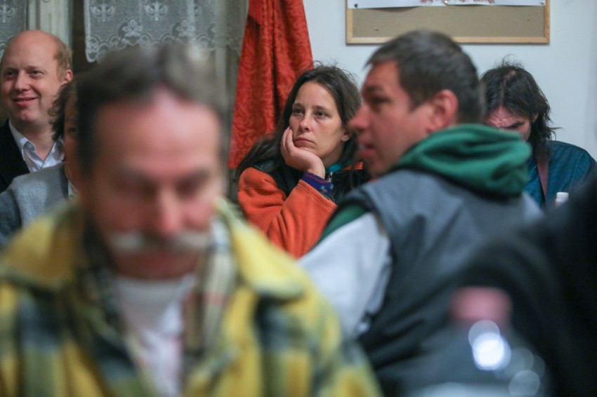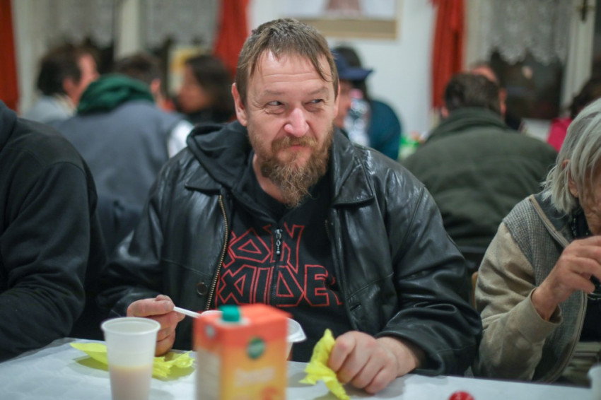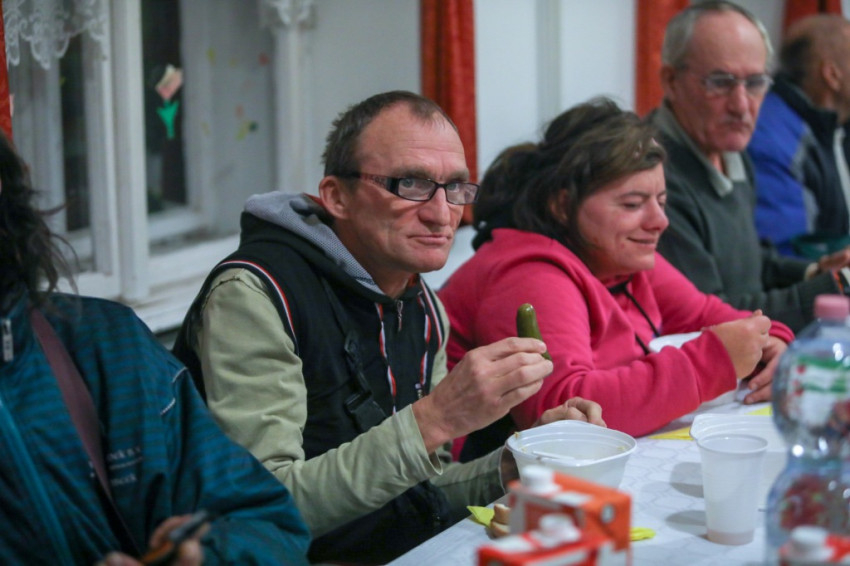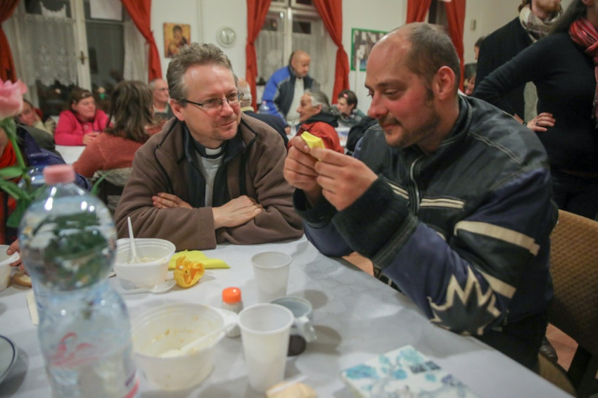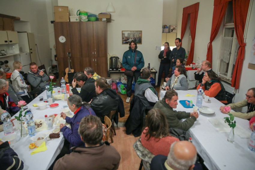 A szentmise után a közösségi terem terített asztalaihoz ültek le a szegények és a közösség tagjai, hogy baráti beszélgetés és zenés műsor mellett költsék el a finom vacsorát, mely Konkoly Edit konyhájában készül – a Száron található „Élni jó házban” a közösség barátaival együtt havonta egyszer közösen főznek és szállítják az ízletes ételeket Budapestre.