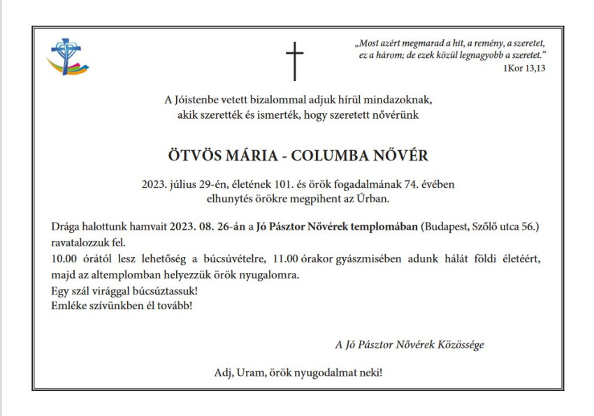 Columba nővér 2022. november 15-én ünnepelte 100. születésnapját. Egészségi állapota azonban folyamatosan romlott, ezért idén májusban a Farkas Edith Szeretetotthonba került, ahol július 29-én befejezte földi pályafutását.