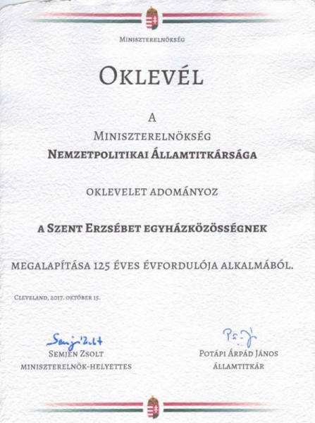 A szentmisét követő ünnepség elején Cleveland polgármestere, Frank G. Jackson is megjelent, az évforduló alkalmából gratulált a magyar közösségnek. Szilágyi Péter nemzetpolitikáért felelős helyettes államtitkár átadta a Miniszterelnökség Nemzetpolitikai Államtitkárságának oklevelét Antal András plébánosnak. Ezután Bencsik Zita Ilona chicagói főkonzul is szólt a jelenlévőkhöz.